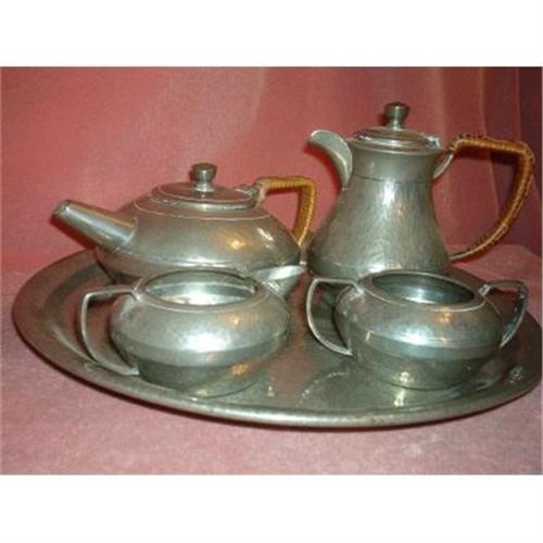 Circa 1920 this set is marked "ARTISTIC PEWTER, HAND HAMMERED, MADE IN ENGLAND" IT CONSISTS OF A TEAPOT, A COFFEE OR HOT WATER POT, A CREAMER, A SUGAR BOWL AND A CIRCULAR TRAY.The tray measures 14.5" in diameter. The handles on the tea and coffee pot are wrapped in rattan or wicker to alleviate heat.Circa 1920