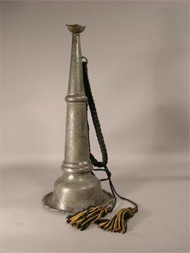 Presentation grade pewter fire trumpet with eagle tassel holders, Foreman for Excelsior Fire Co. #1, 21" long, small hole top of bell. May have been reattached. Bent mouth piece.