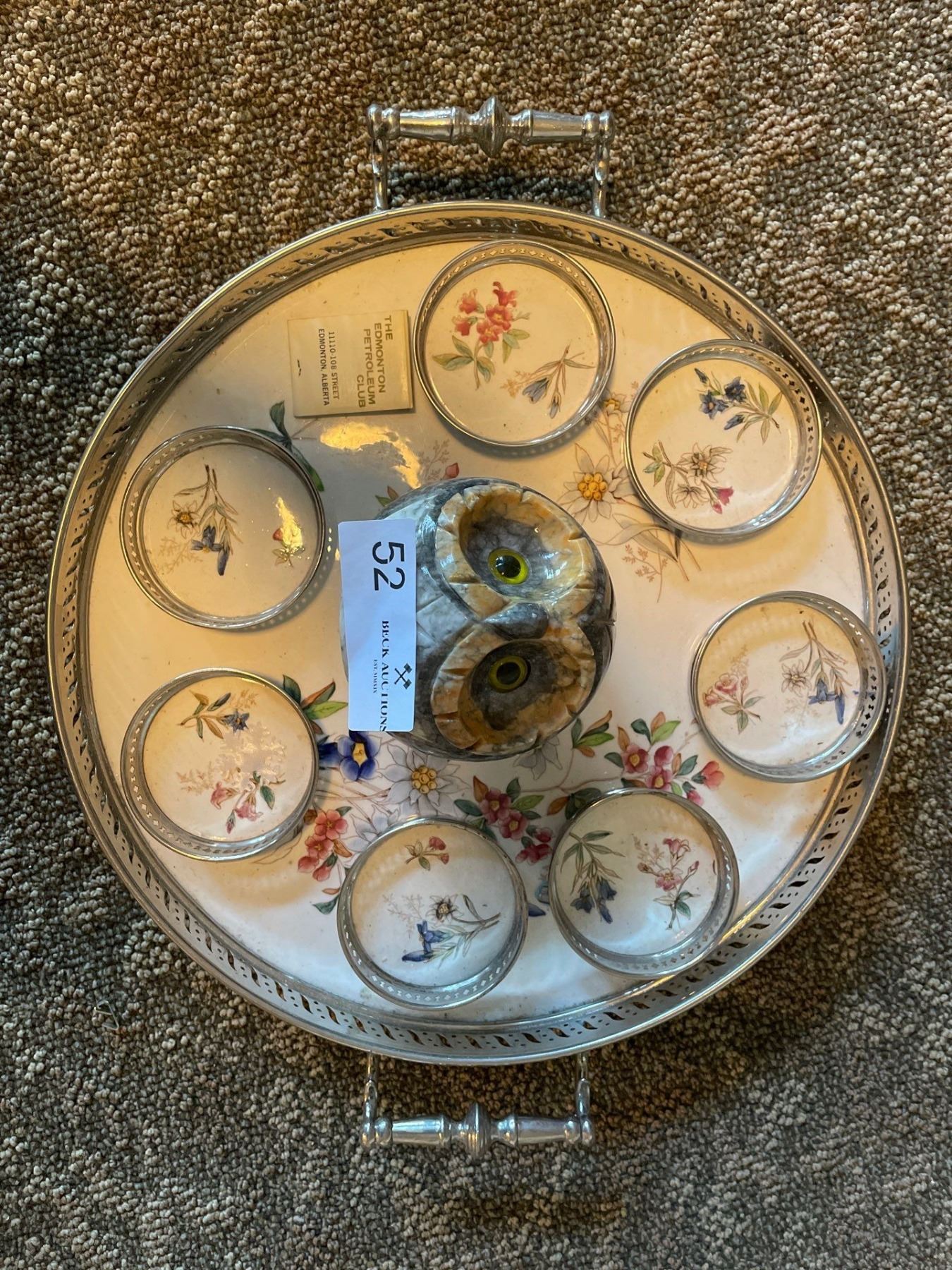 Pewter Floral Serving Tray With Coasters & Decorative Soap Stone Owl