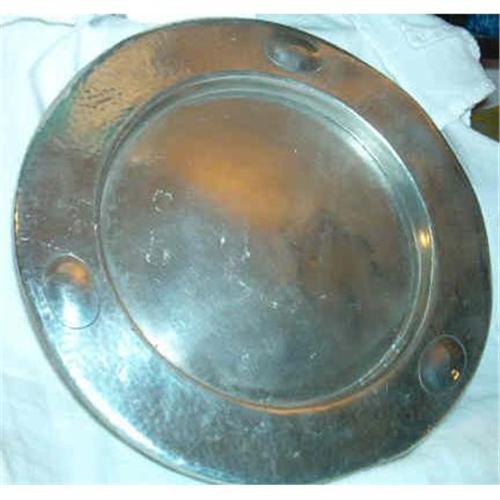 A Hand hammered pewter plate. 11.1/4" in diameter. Marked "Community Pewter. English Make" Rolled edge. Circa 1930