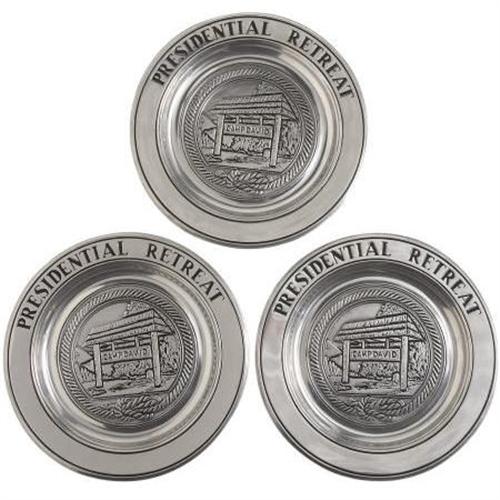 <B>Pewter Plates from Camp David During the Bush Years</B></I> This lot consists of three Wilton pewter plates embossed with the Camp David sign and logo. Each reads " Presidential Retreat" along the rim. The plates are 10.5" in diameter and are marked Wilton on the back <I>From the personal collection of Sharon Bush</B></I><BR><BR><b>Shipping:</b> Hollowware/Pottery/Glass, Large (<a target="_blank" href="http://www.heritageauctions.com/common/shipping.php">view shipping information</a>)
