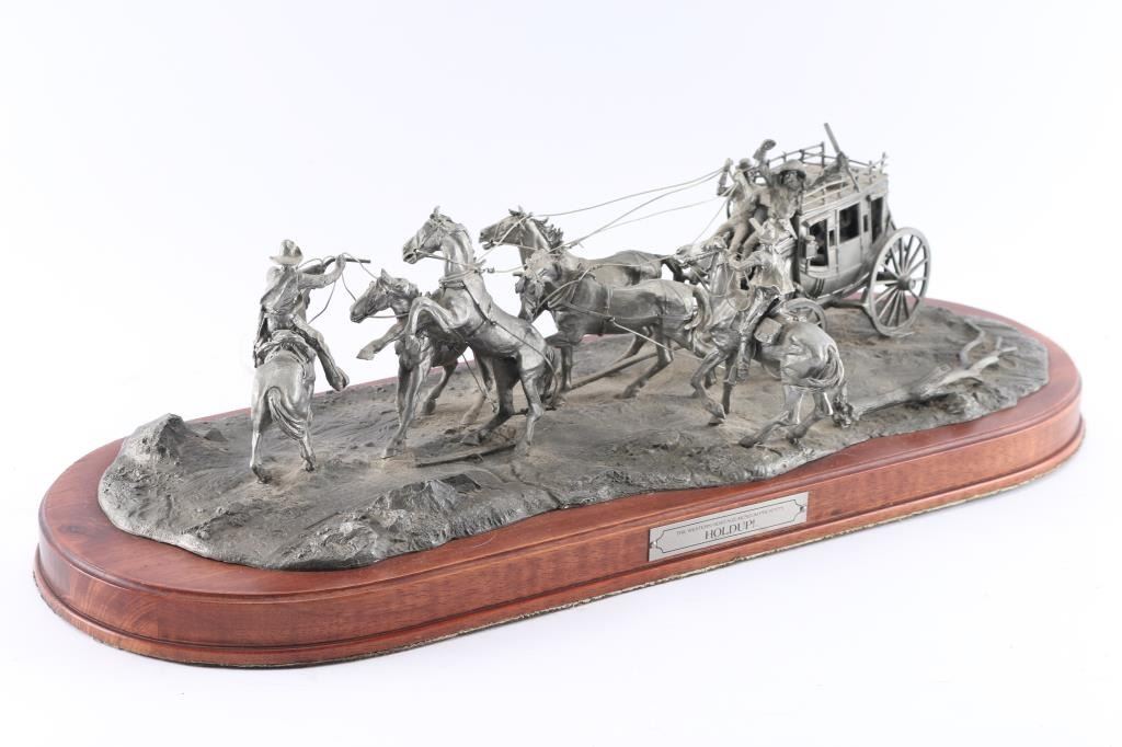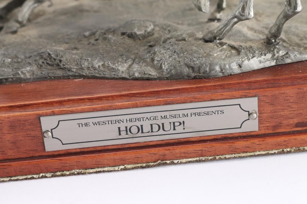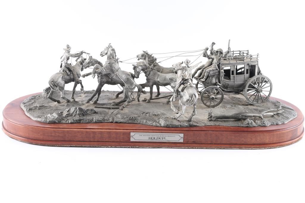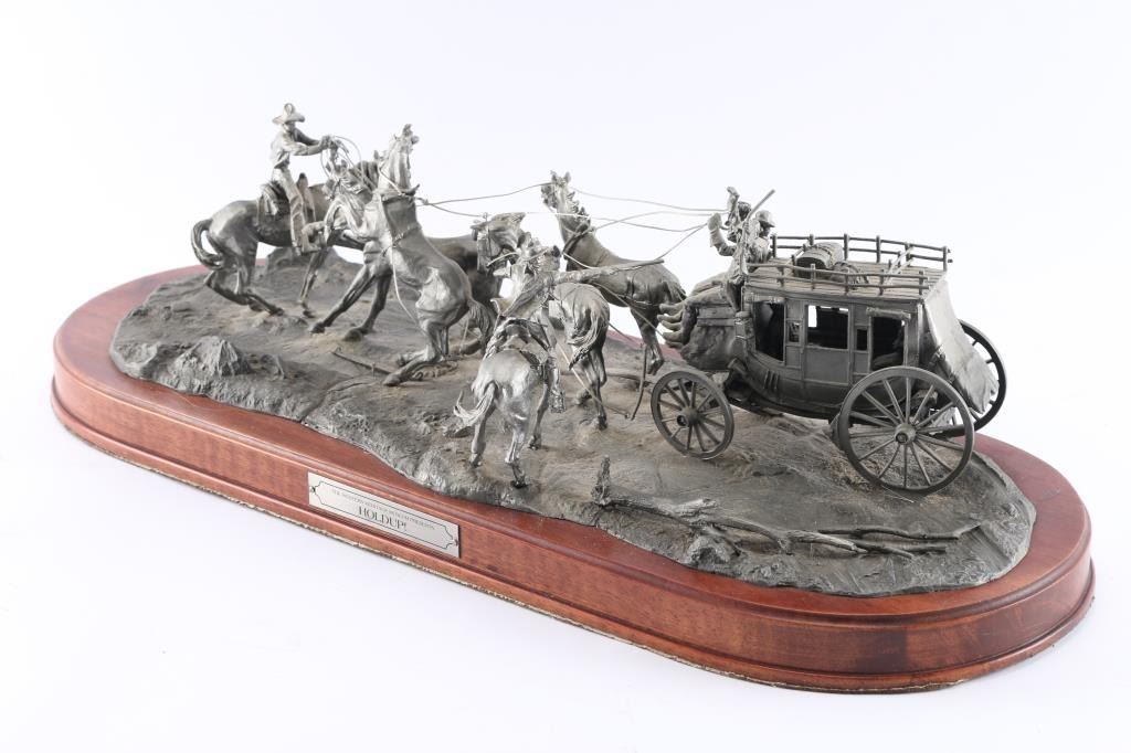 Presented by The Western Heritage Museum. On wood base. Measures 22" long by 8" deep by 6" tall. Slight damage to the reins.