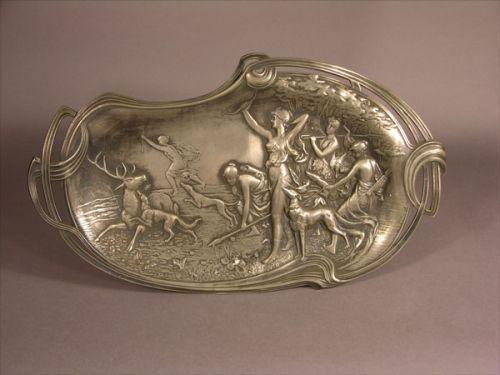 Pewter Serving Tray depicting hunting scene with women, elk and dogs. Unmarked, good condition. 16 X 9 1/2 inches.
