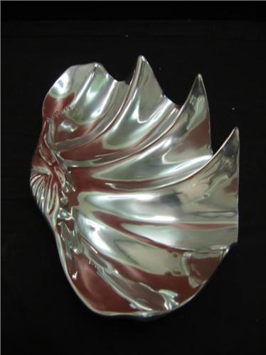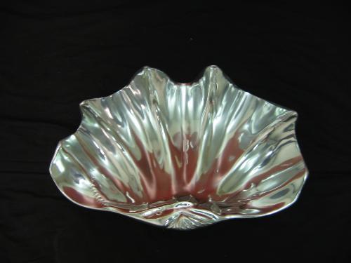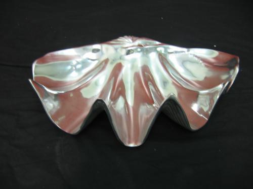 Pewter shell-shaped serving dish is 19" wide and 11" deep and is a product of Bruce Fox Design.