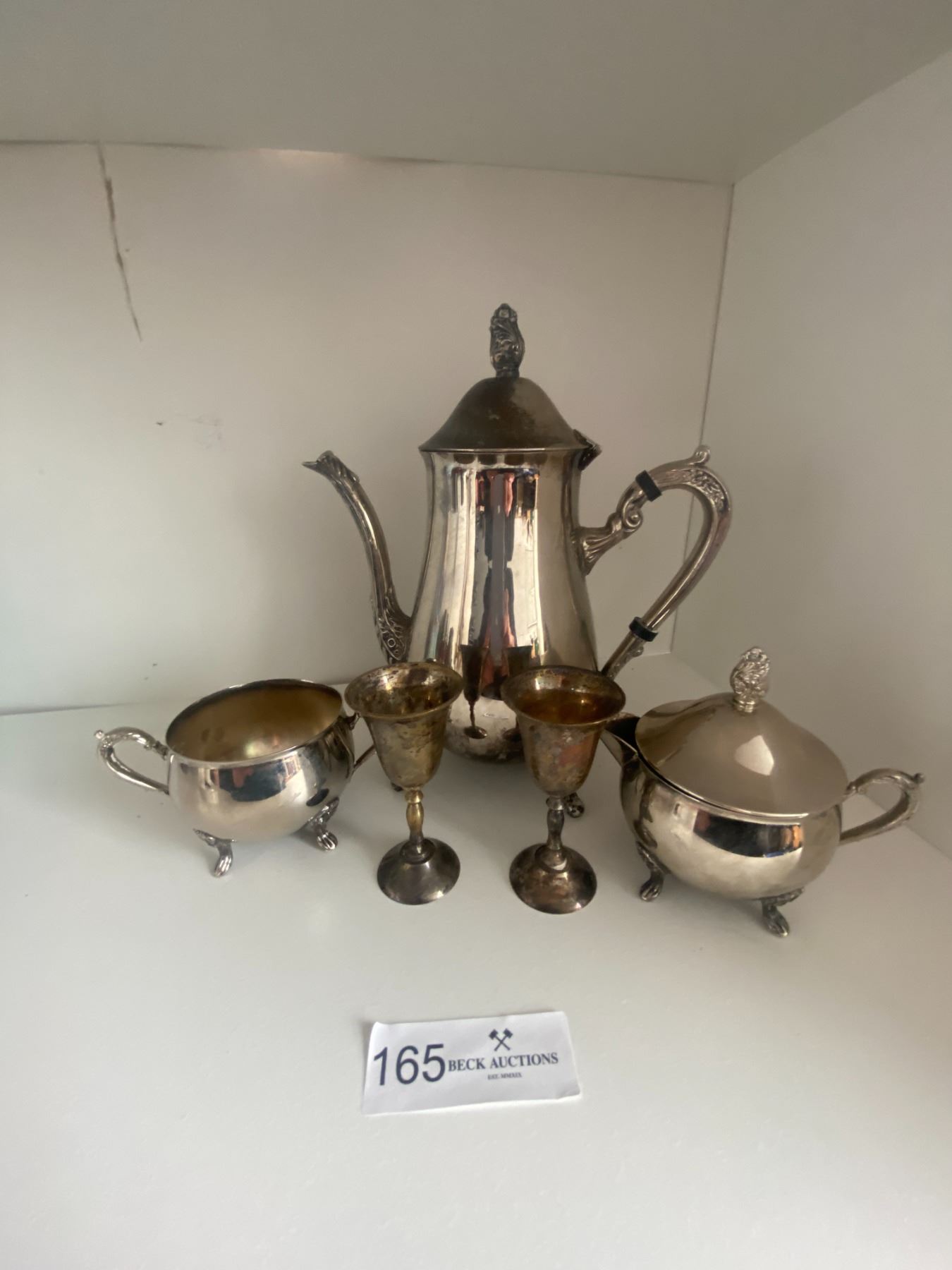 Pewter Tea Pot(10" high) With Cream & Sugar Bowl