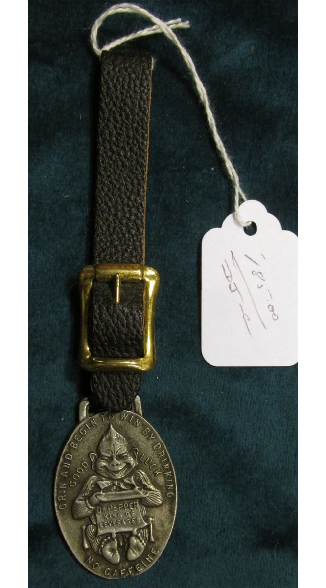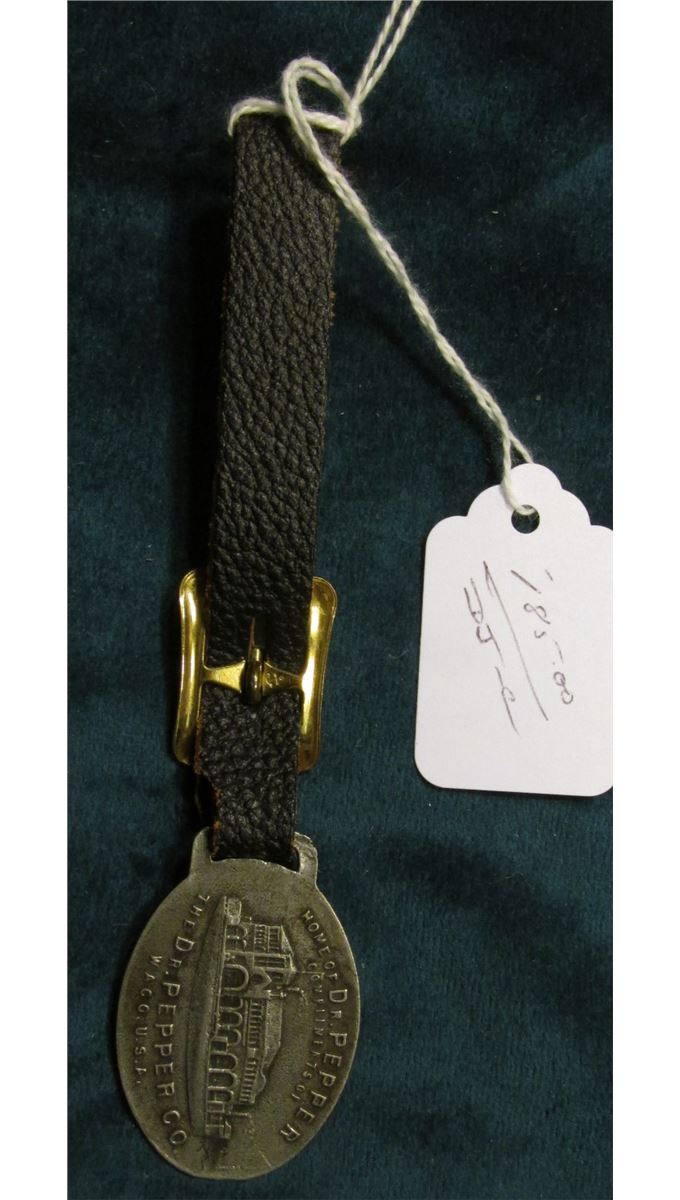 Pewter Watch Fob with leather strap "Home of Dr. Pepper/Compliments of/The Dr. Pepper Co./Waco, U.S.