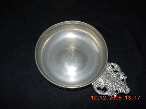 On the bottom of the bowl, the inscription says Stieff Pewter and Old Sturbridge Village. The diameter measures about 5.125". Including the handle the piece measures approximately 7.375"