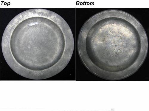 Pewter plate and pewter whale oil lamp; plate with touchmarks on back; lamp is unmarked; 19th C.; 9" diameter on plate; lamp measures 2 3/4" high (some denting to bottom of lamp