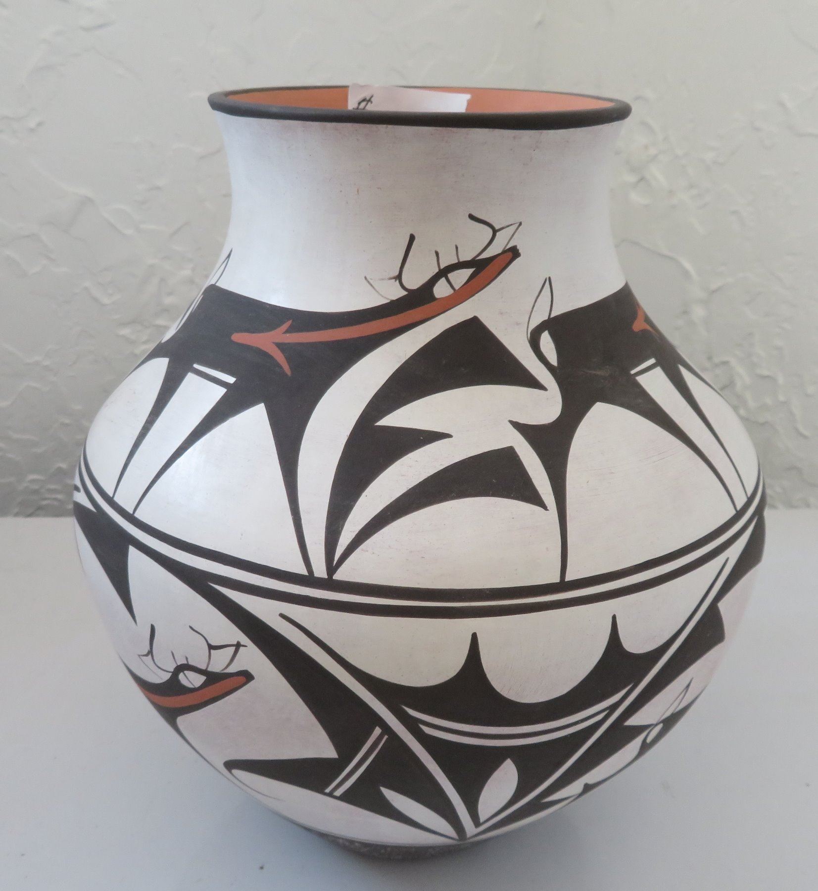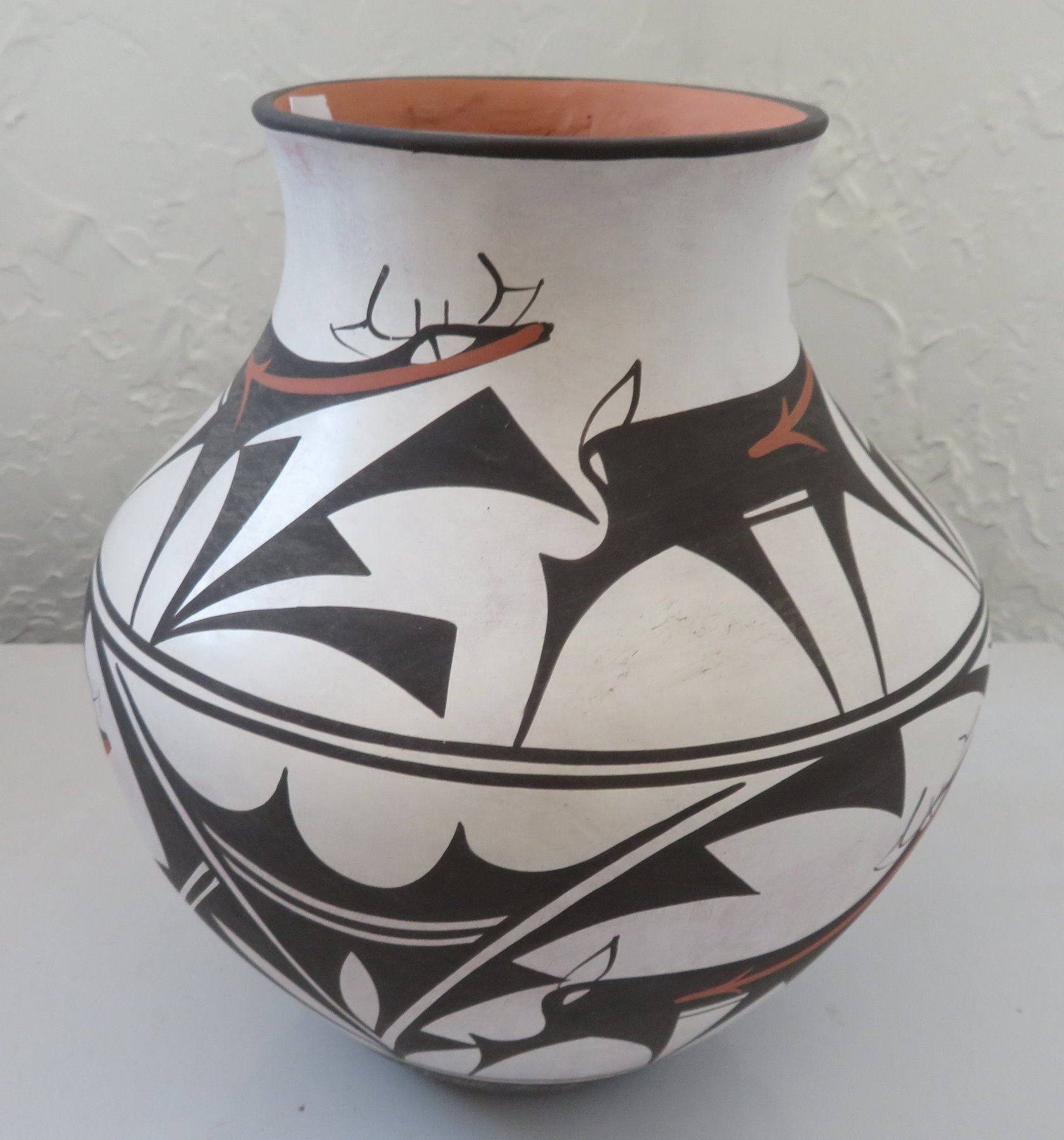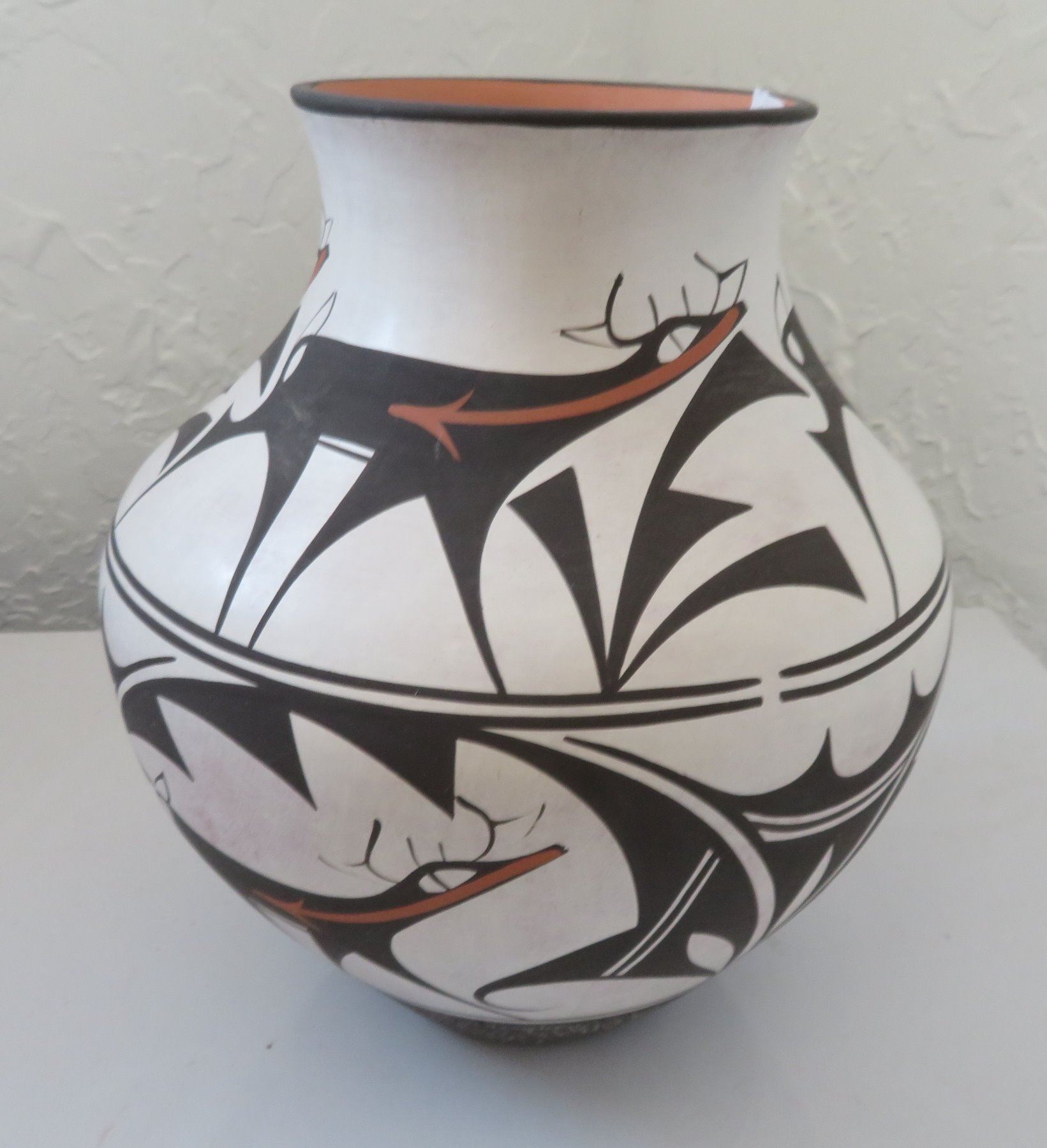 Peynetsa Zuni Heartline Olla, signed 2000. Made of clay and paint, the item measures 8 1/2" x 7". Signed A. Peynetsa, Zuni, 2000. Anderson's work is often sold in high-end galleries. Condition: Good, see images. Shipping: $50.00 w/insurance and signature, double-boxed, due to value.