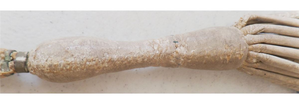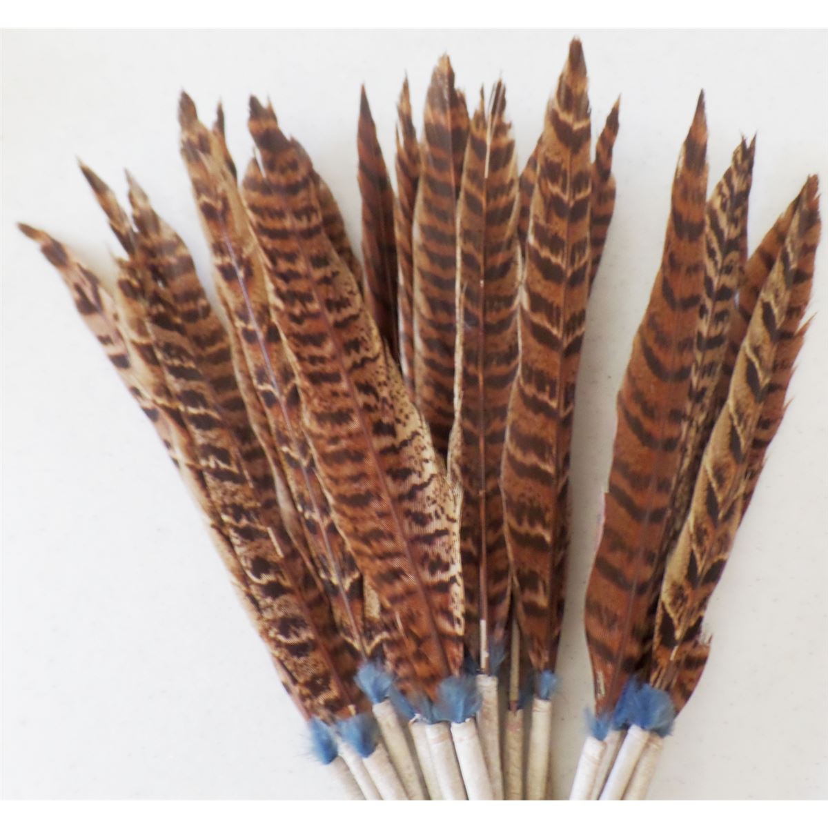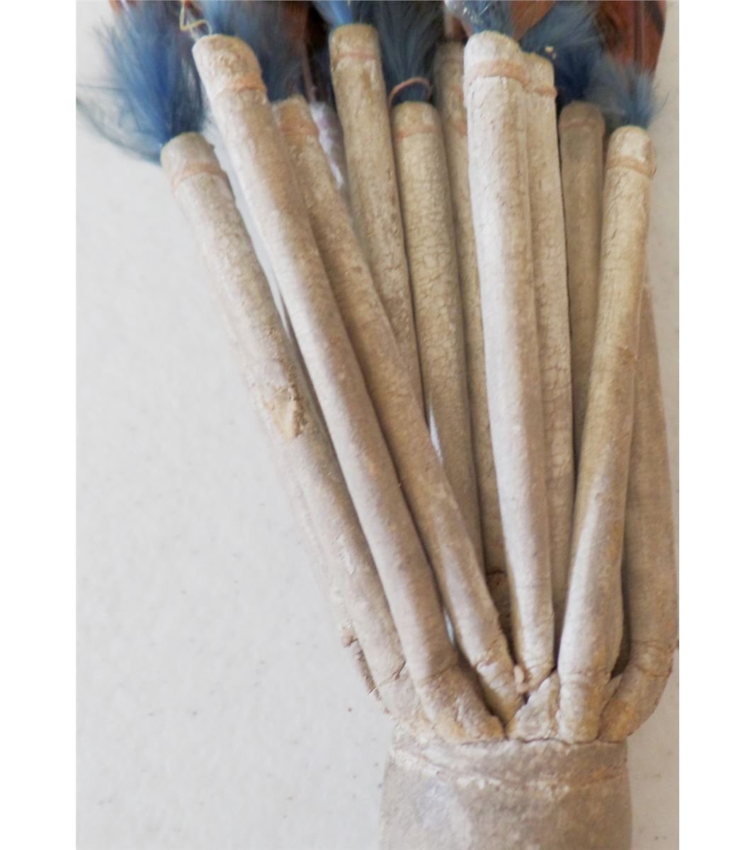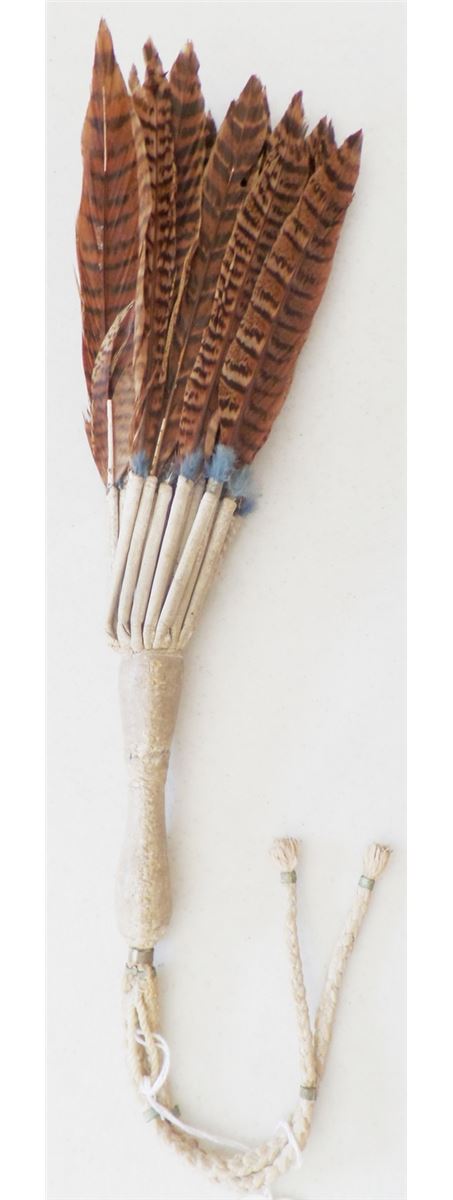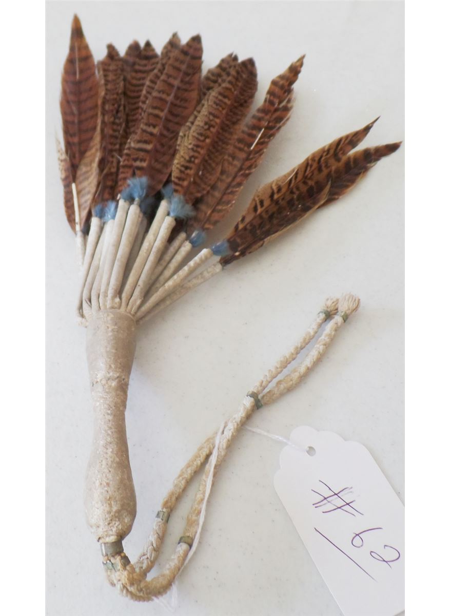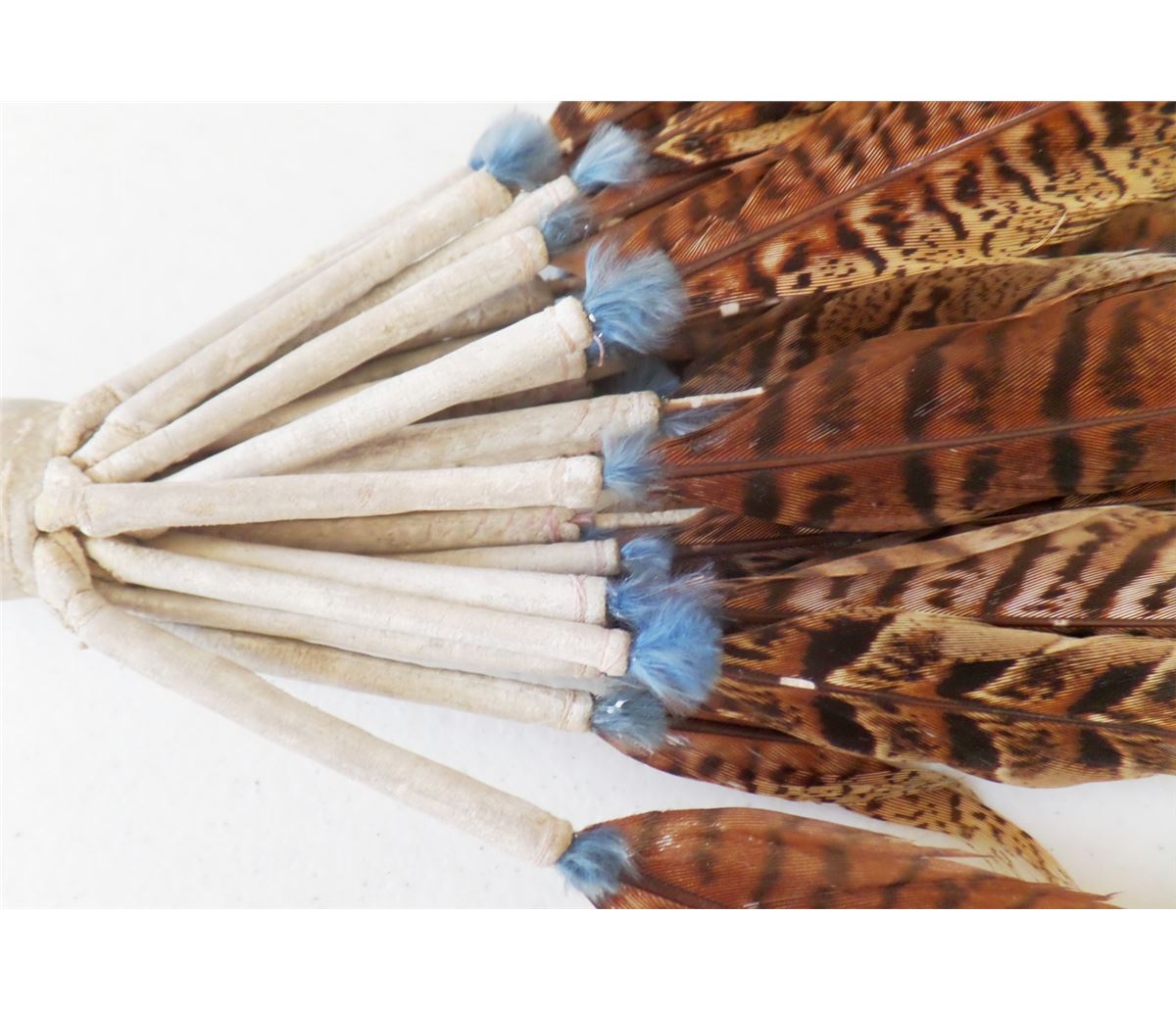 Peyote Dance Fan with 24 pheasant feathers with a deer hide wrap and deer hide lace. This item is from Oklahoma and measures a total 18 inches by 2 inches. Condition: Used and is missing 2 feathers. Shipping $14.50