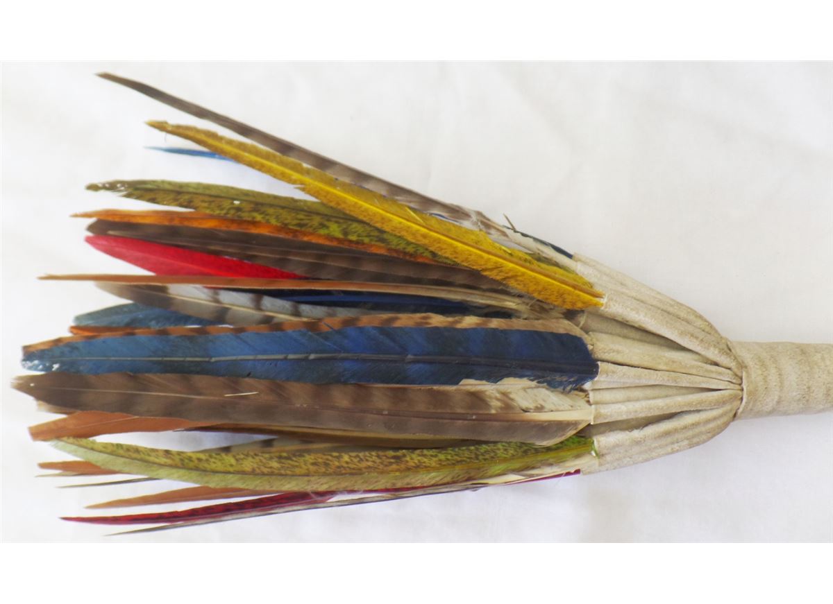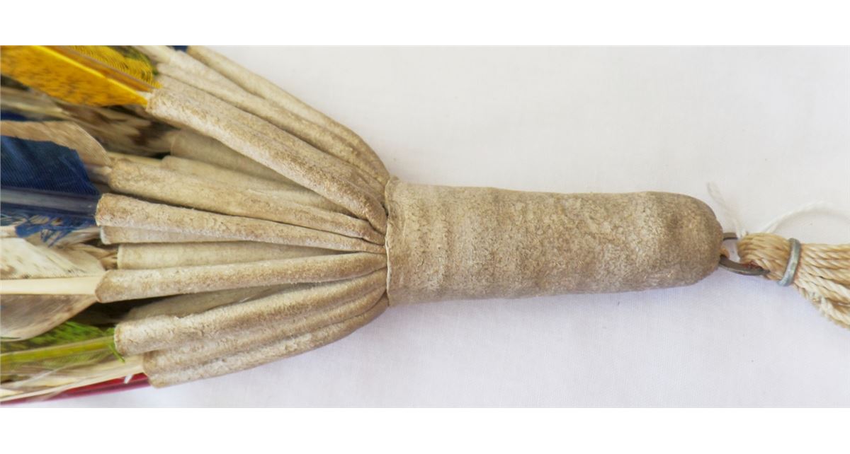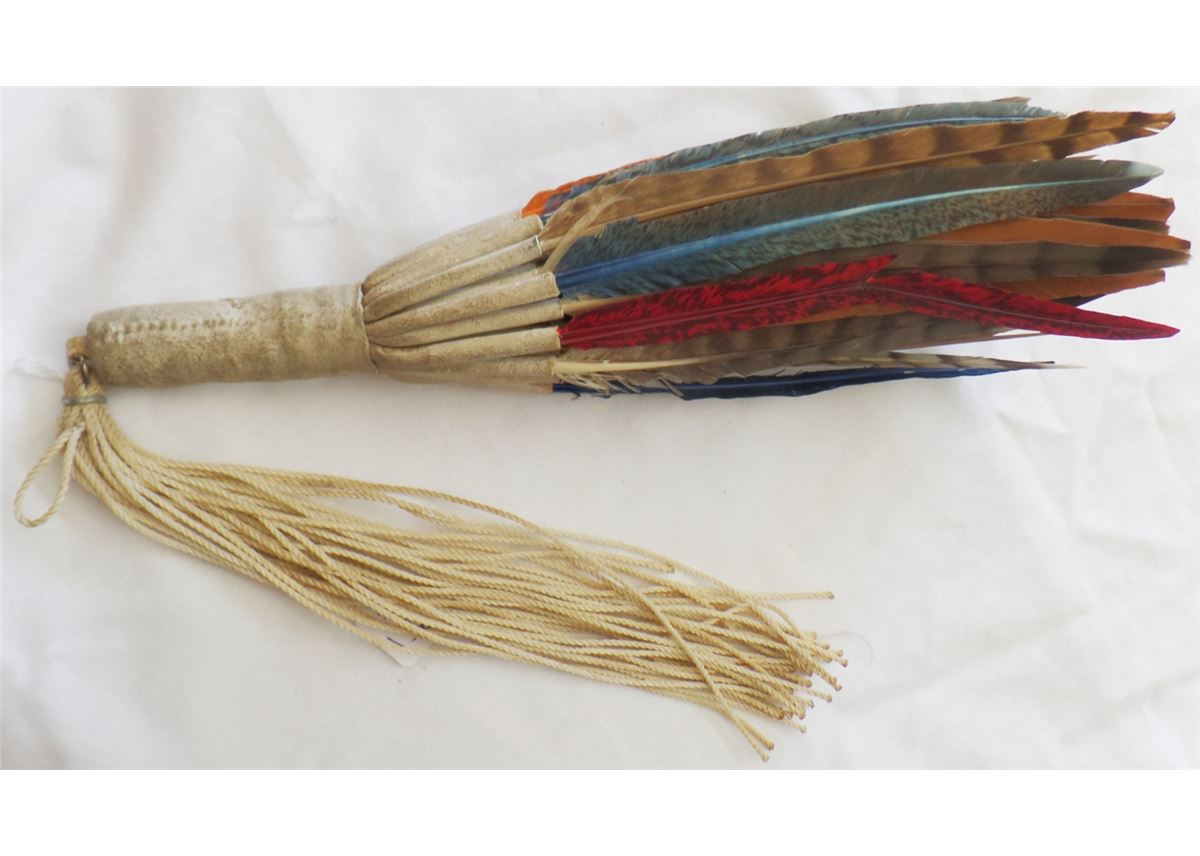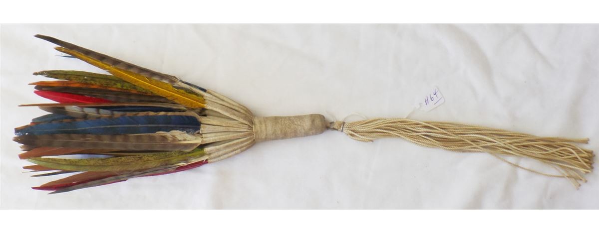 Peyote Dance Fan. C. 1950s. Made of feathers, leather, nylon and metal clamp. Measures 21" x 3" and is from Oklahoma. It has about 30 feathers on it. Many feathers have been dyed. Condition: Worn from dance use, see images. Shipping: $14.50.