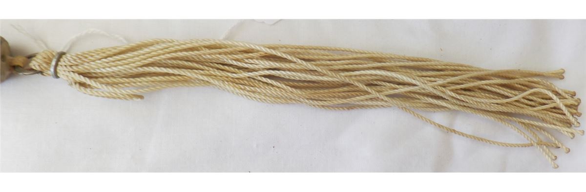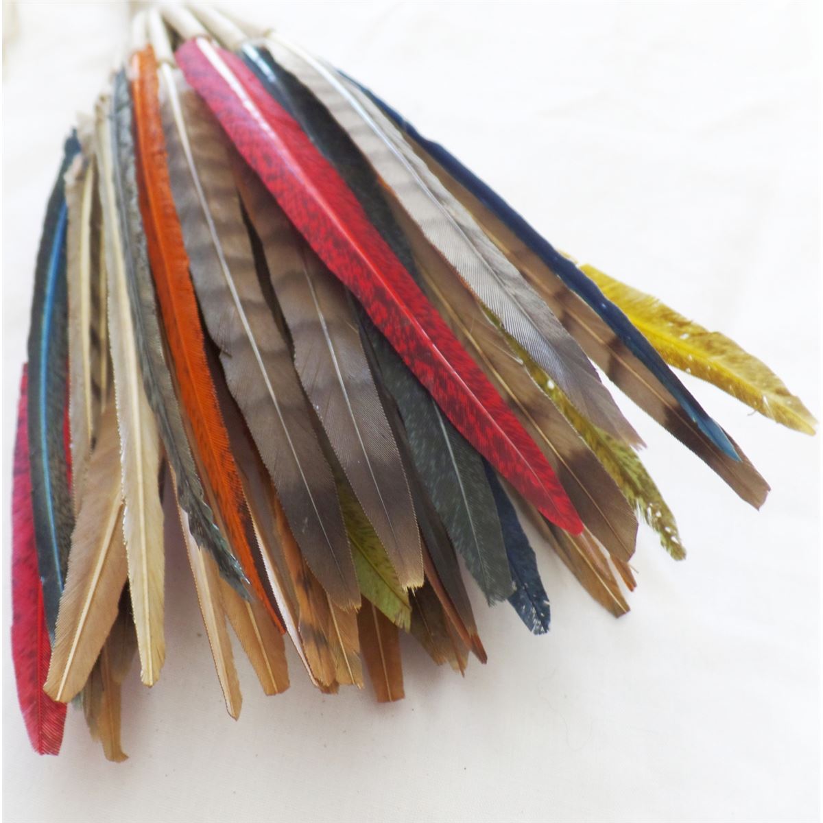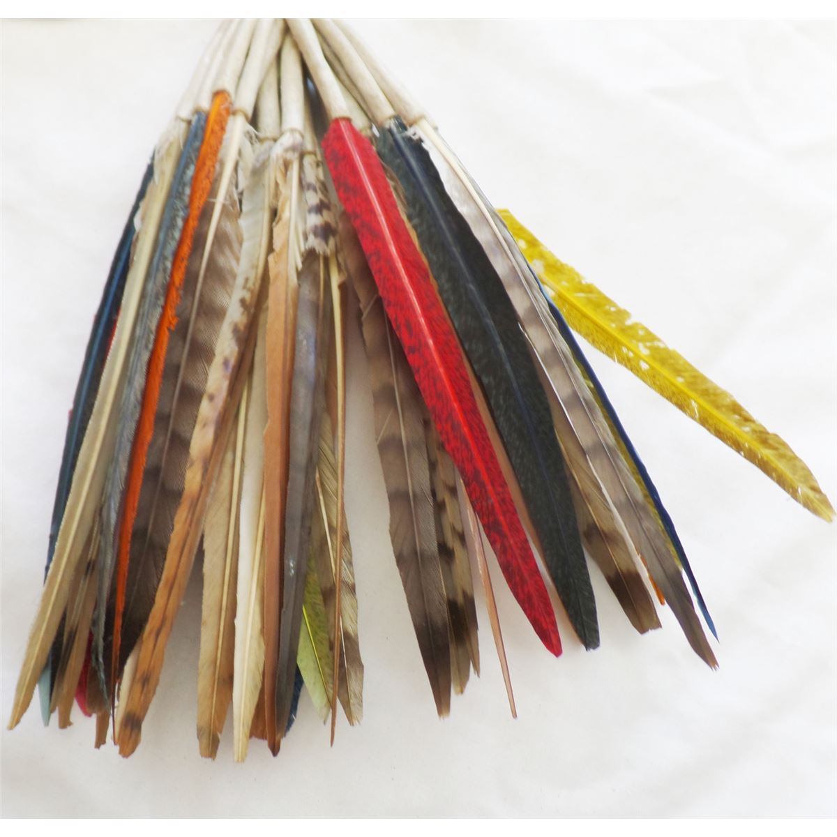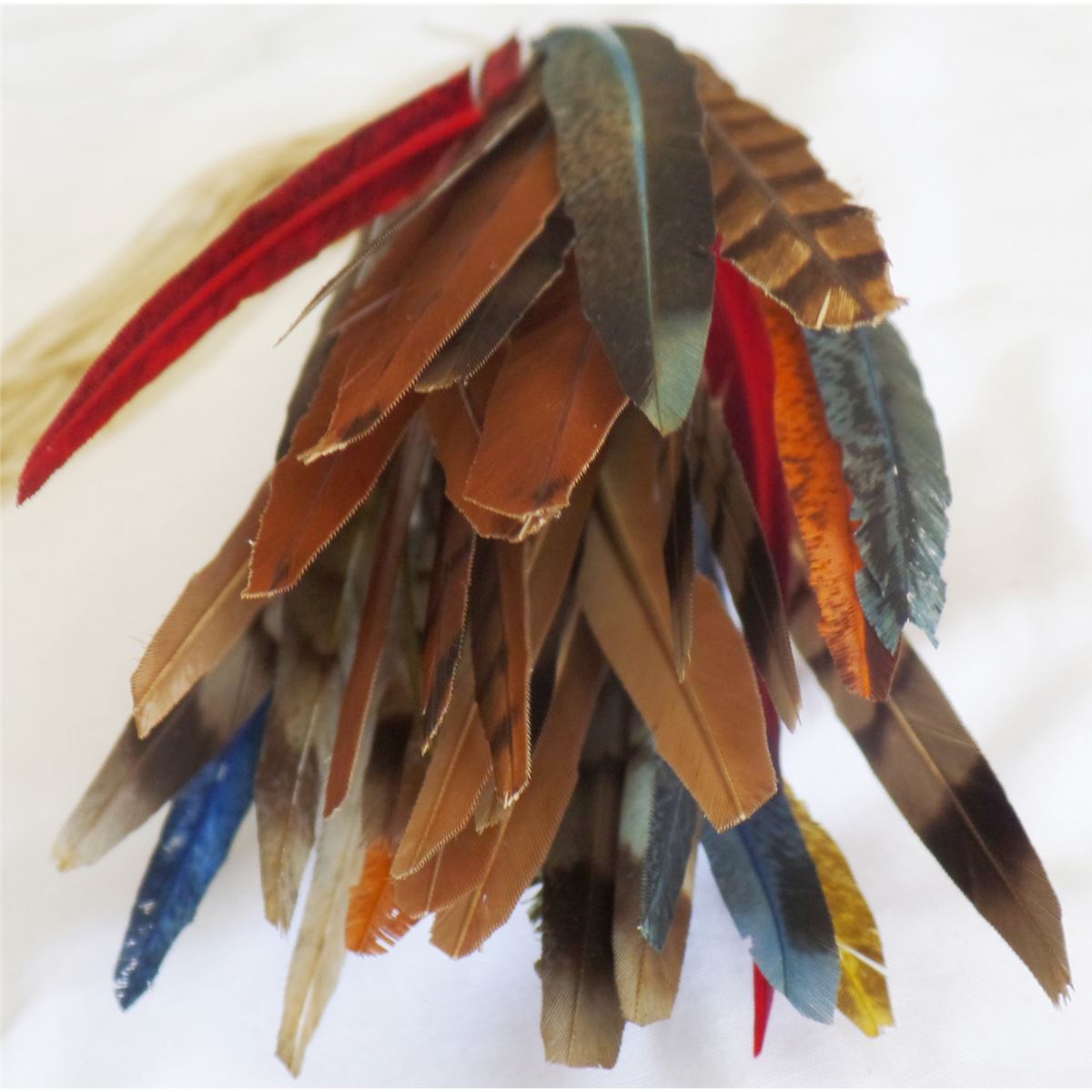 Peyote Dance Fan. C. 1950s. Made of feathers, leather, nylon and metal clamp. Measures 21" x 3" and is from Oklahoma. It has about 30 feathers on it. Many feathers have been dyed. Condition: Worn from dance use, see images. Shipping: $14.50.