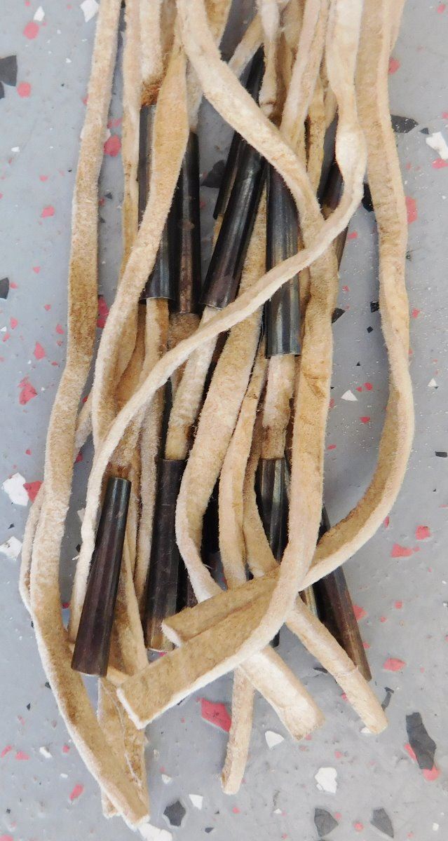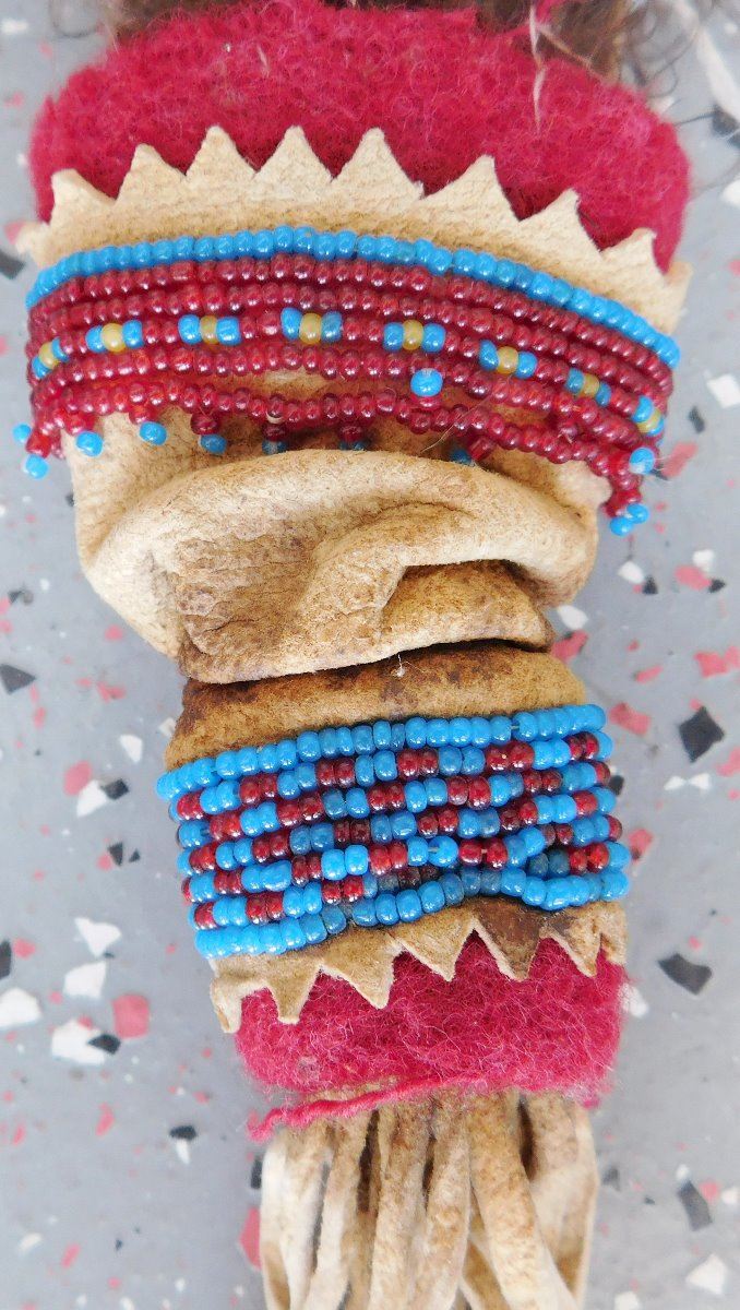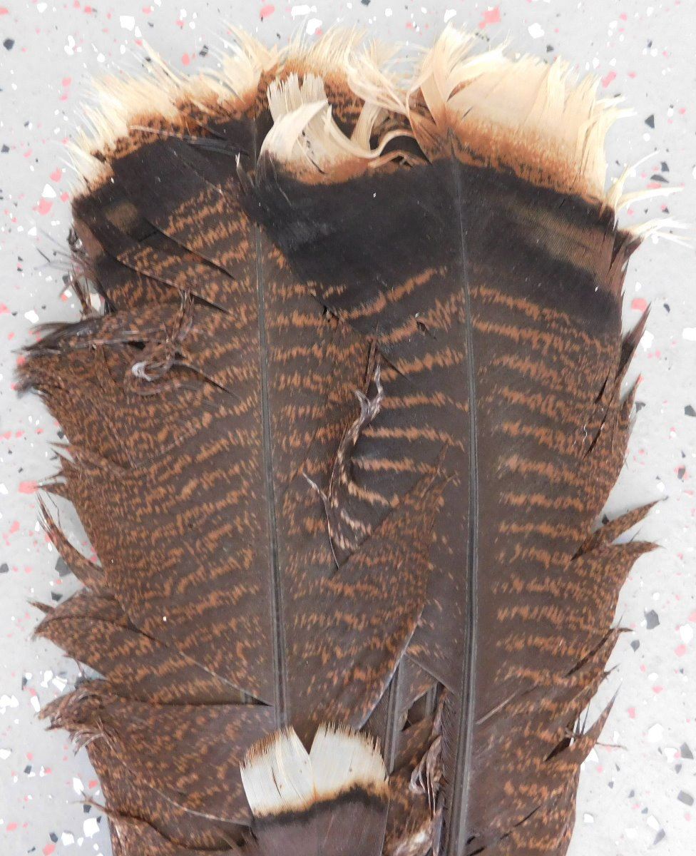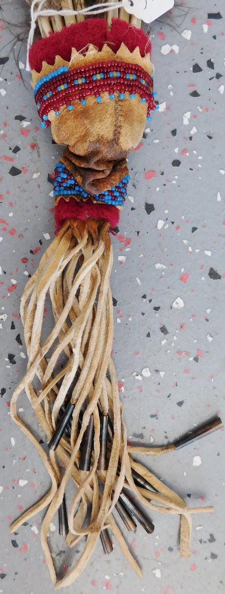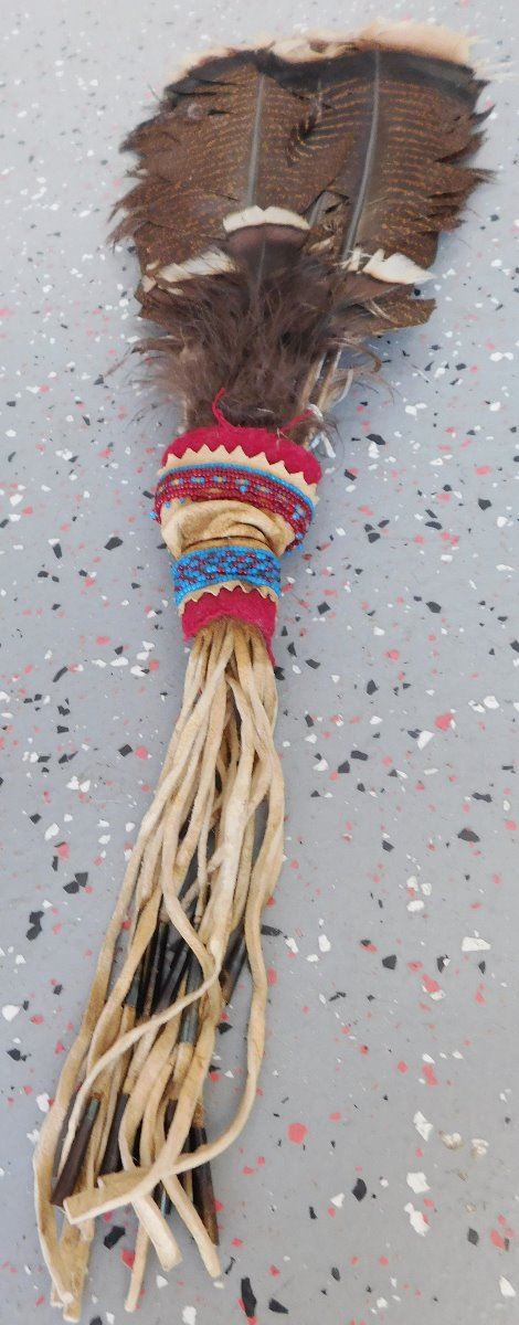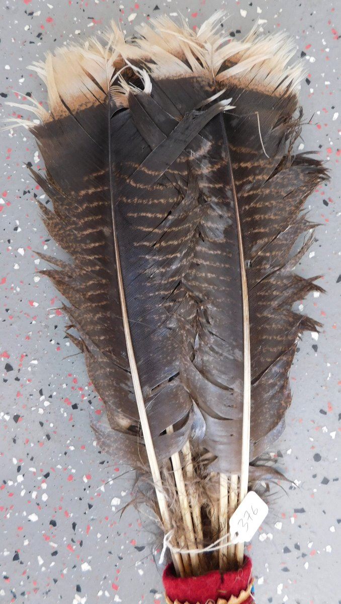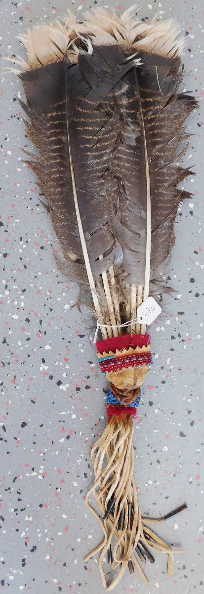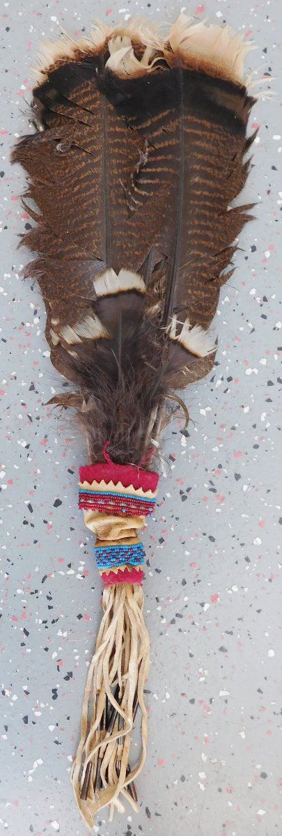 Peyote Dance Fan, circa 1930s. Made of turkey feathers, leather, glass beads, cloth and tin cones, the item is 6" wide x 22.5" long w/fringe. Plains Indian. Condition: Good, has been danced, see images. Shipping: $23.50 w/insurance and signature, due to length.