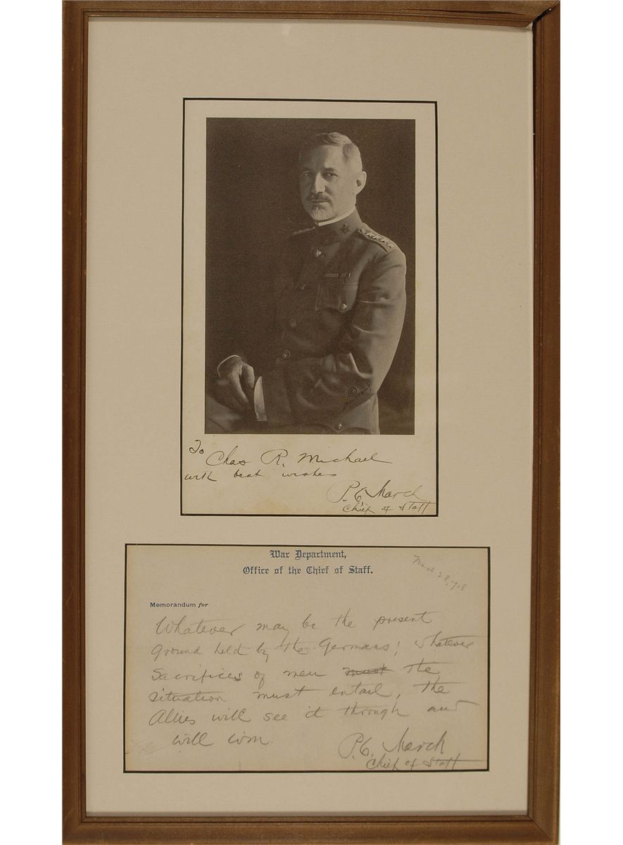 Former Army Chief of Staff (1864–1955). AQS, in pencil, on an off-white 7.75 x 5 sheet of War Department, Office of the Chief of Staff stationery. March writes: “Whatever may be the present ground held by the Germans; Whatever sacrifices of men the situation must entail, the Allies will see it through and will win.” Signed at the conclusion, “P. C. March Chief of Staff.” Matted and framed with a 5.25 x 8.75 photo, signed and inscribed to Charles R. Michael, to an overall size of 10.25 x 18.25. In fine condition, with central horizontal and vertical fold to quote, a couple light pencil notations, and some light soiling.