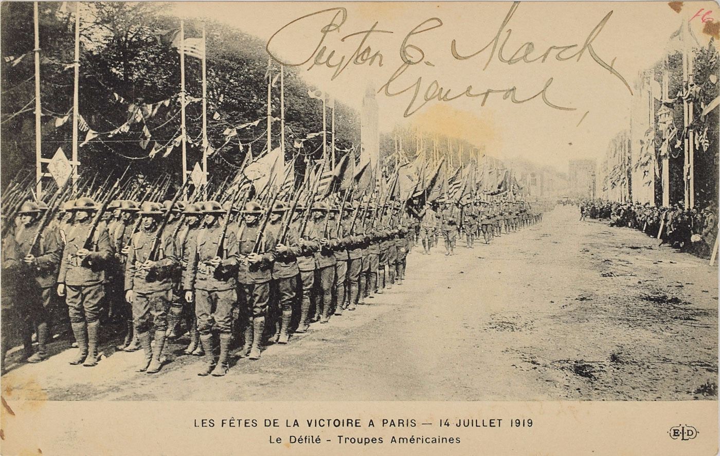 American soldier (1864–1955) who served as Army chief of staff during World War I, a position in which he reorganized the structure of the US Army. Vintage 5.5 x 3.5 postcard depicting American troops at the Bastille Day military parade on July 14, 1919, signed in fountain pen, "Peyton C. March, General." In fine condition, with a light stain beneath the signature.
