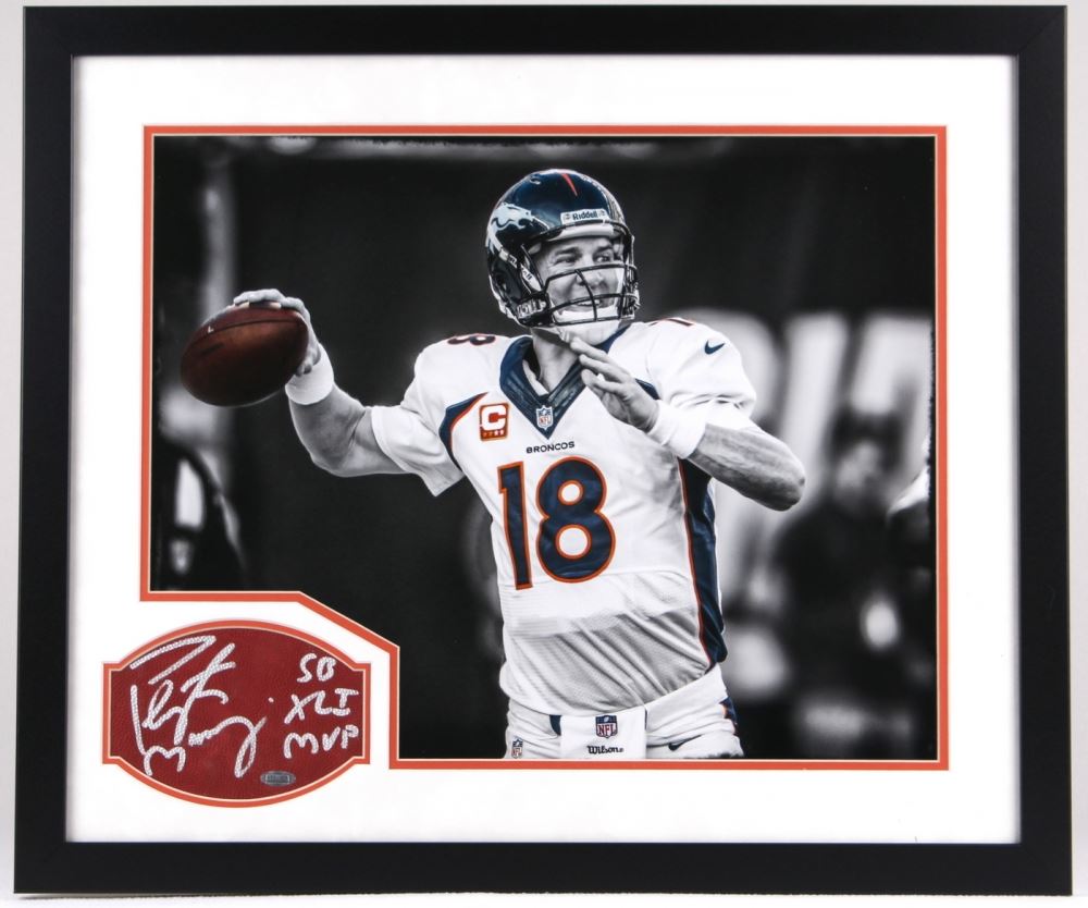 Custom framed display measures approximately 22" x 26" in size. Features an autographed leather football insert that has been hand-signed and inscribed in silver paint pen by Peyton Manning (Colts). The autograph includes an official Steiner hologram and matching COA for authenticity purposes.