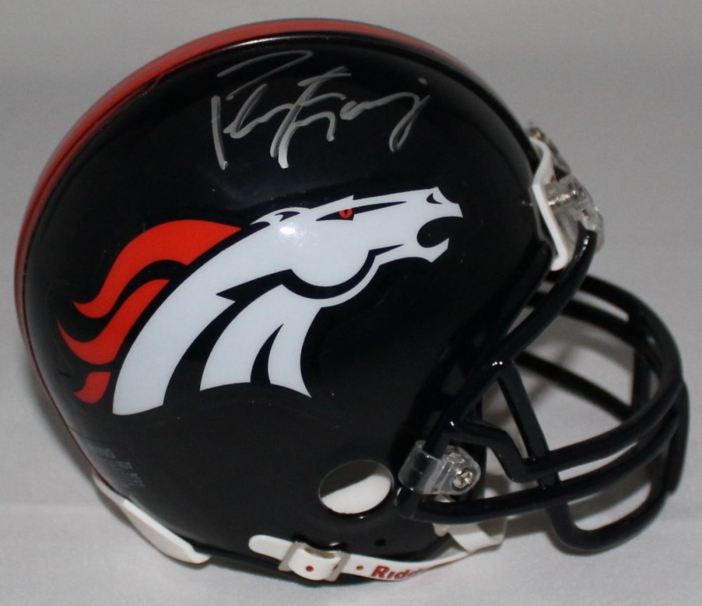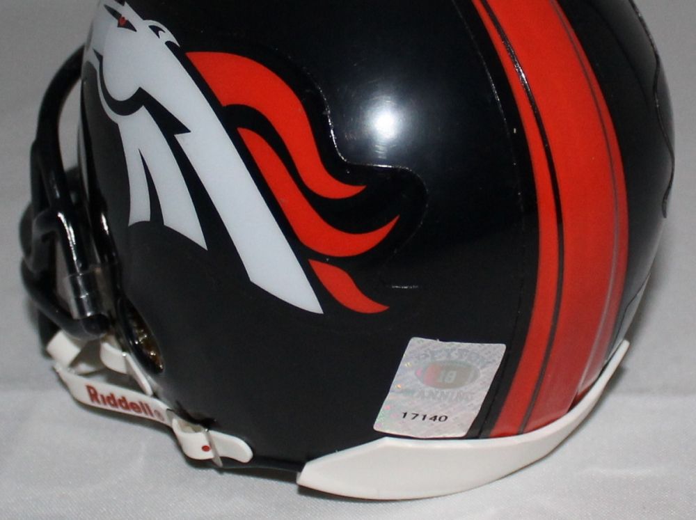 Riddell mini-helmet hand-signed in silver paint pen by Peyton Manning (Broncos). Autograph includes an official Peyton Manning Hologram for authenticity purposes.