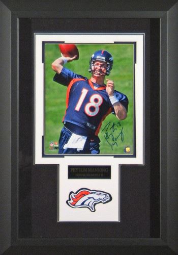 Peyton Manning will surely go down in history as one of the best quarterbacks to ever play the game of football. His accomplishments are staggering. A Pro Bowl choice every year since he stepped onto a NFL field in 1998, Manning set a NFL single-season record in 2004 with 49 touchdown passes and has thrown for nearly 40,000 regular-season yards in his career. He was released by the Colts on March 7, 2012, and after an almost two-week period where he visited with and worked out for several NFL teams, he signed with the Denver Broncos on March 20, 2012. Peyton Manning has hand signed this Denver Broncos 11x14 Photo. Premium Custom Wood Framed as shown with plaque and official Denver Broncos team patch. Overall Framed Size: 22 x 32". Witnessed, Examined, and Certified Authentic (Lifetime) by Millionaire Gallery, Inc.