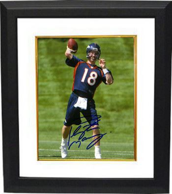 Peyton Manning will surely go down in history as one of the best quarterbacks to ever play the game of football. His accomplishments are staggering. A Pro Bowl choice every year since he stepped onto a NFL field in 1998, Manning set a NFL single-season record in 2004 with 49 touchdown passes and has thrown for nearly 40,000 regular-season yards in his career. He was released by the Colts on March 7, 2012, and after an almost two-week period where he visited with and worked out for several NFL teams, he signed with the Denver Broncos on March 20, 2012. Peyton Manning has hand signed this Denver Broncos 8x10 Photo. Certificate of Authenticity from Athlon Sports. Custom White Mat and Premium Black Frame as shown.