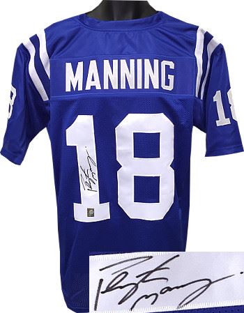 Peyton Manning played 18 seasons in the NFL. A five-time league MVP, he played for the Indianapolis Colts for 14 seasons between 1998 and 2011, and then with the Denver Broncos for four seasons from 2012 to 2015. Manning is a two-time Super Bowl winner (XLI and 50), and also appeared in the game two other times, becoming the only quarterback to start the Super Bowl for two different franchises more than once each and the only starting quarterback to win a Super Bowl with two different franchises. He is a son of former NFL quarterback Archie Manning and older brother of New York Giants quarterback Eli Manning. Peyton Manning has hand signed this Blue Prostyle Indianapolis Colts jersey, which comes complete with a Peyton Manning Hologram and Certificate of Authenticity from Athlon Sports Collectibles. Size XL
