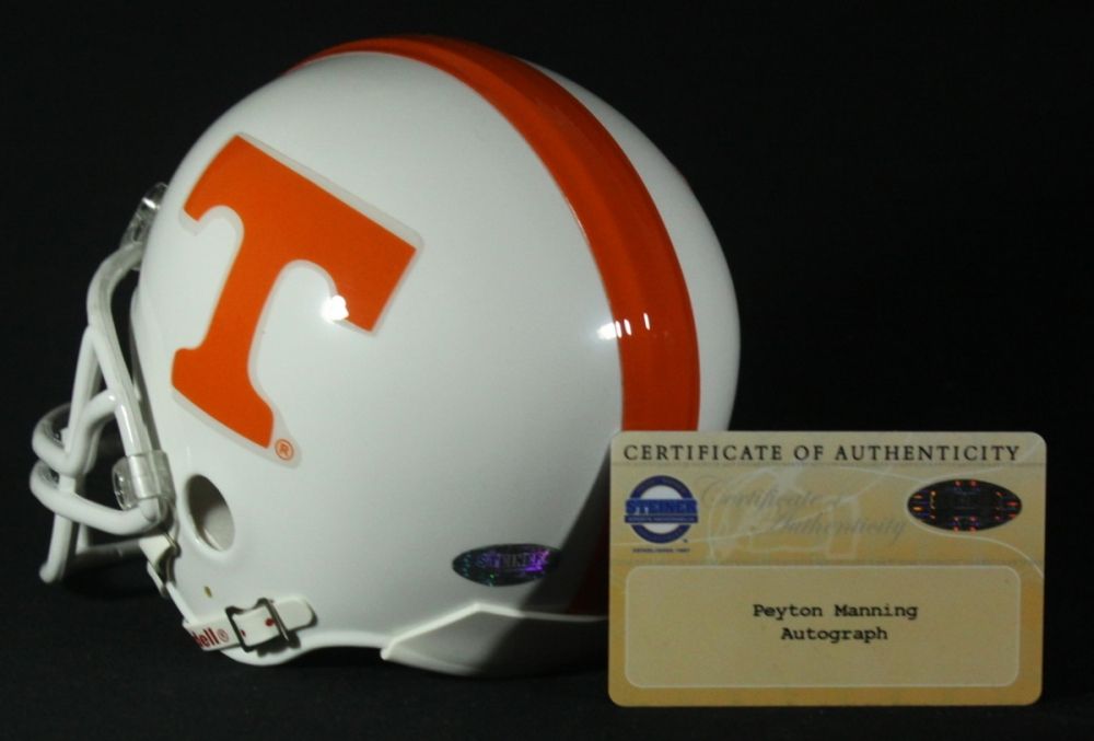 Riddell mini-helmet hand-signed in black felt-tip pen by Peyton Manning. Includes an official Steiner Sports hologram and matching COA for authenticity purposes.