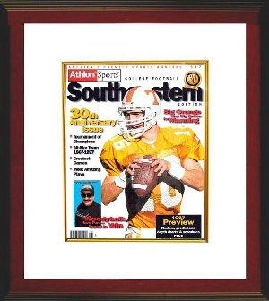 Peyton Manning is Tennessee's all-time leading passer with 11,201 yards and 89 touchdowns and won 39 of 45 games as a starter, breaking the Southeastern Conference record for career wins. As a senior, Manning won numerous awards; he was a consensus First-team All-American, the Maxwell Award winner, the Davey O'Brien Award winner, the Johnny Unitas Award winner, and the Best College Player ESPY award winner. Tennessee retired Manning's number (#16). This is a Tennessee Vols 8x10 1997 Athlon Cover Photo of Tennessee Vols Superstar Peyton Manning. White Mat and Wood Color Framed as shown.