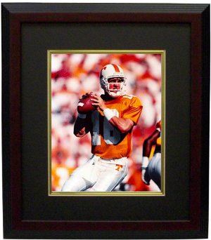 Peyton Manning is Tennessee's all-time leading passer with 11,201 yards and 89 touchdowns and won 39 of 45 games as a starter, breaking the Southeastern Conference record for career wins. As a senior, Manning won numerous awards; he was a consensus First-team All-American, the Maxwell Award winner, the Davey O'Brien Award winner, the Johnny Unitas Award winner, and the Best College Player ESPY award winner. Tennessee retired Manning's number (#16). This is a Tennessee Vols color 8x10 Photo of Peyton Manning. Black Mat and Dark Mahogany Color Framed as shown.