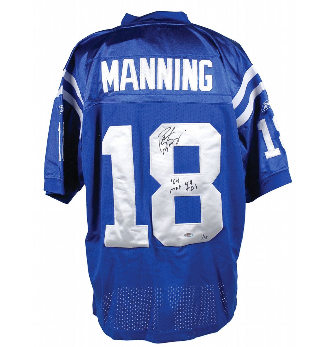 Limited edition official Reebok replica Indianapolis Colts football jersey, with sewn on letters and numbers, numbered 1/18, signed in black felt tip on the number on the back, “Peyton Manning, ’04 MVP, 49 TD’s.” In fine condition, with a Steiner Sports label affixed to the number. Accompanied by a certificate of authenticity from Steiner Sports.