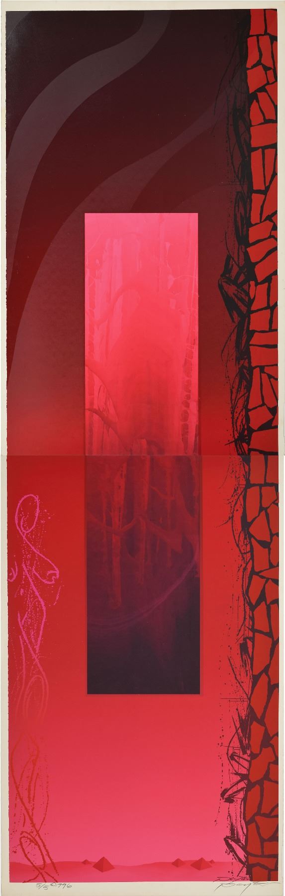 Impressive color limited edition 29.5 x 88 screenprint diptych by Peyton Scott Russell, entitled 'Red Wine,' numbered 5/5, signed in the lower border in pencil by the artist, "Peyton," and marked with a copyright date of 1996. This artwork portrays a red surreal landscape with a high vertical atmosphere and spiritual figures occupying the space in a very organic nature. This work was originally created for Prince's Glam Slam nightclub, but it closed prior to 1996. Each individual sheet of the two-piece diptych measures 29.5 x 44. In fine condition.