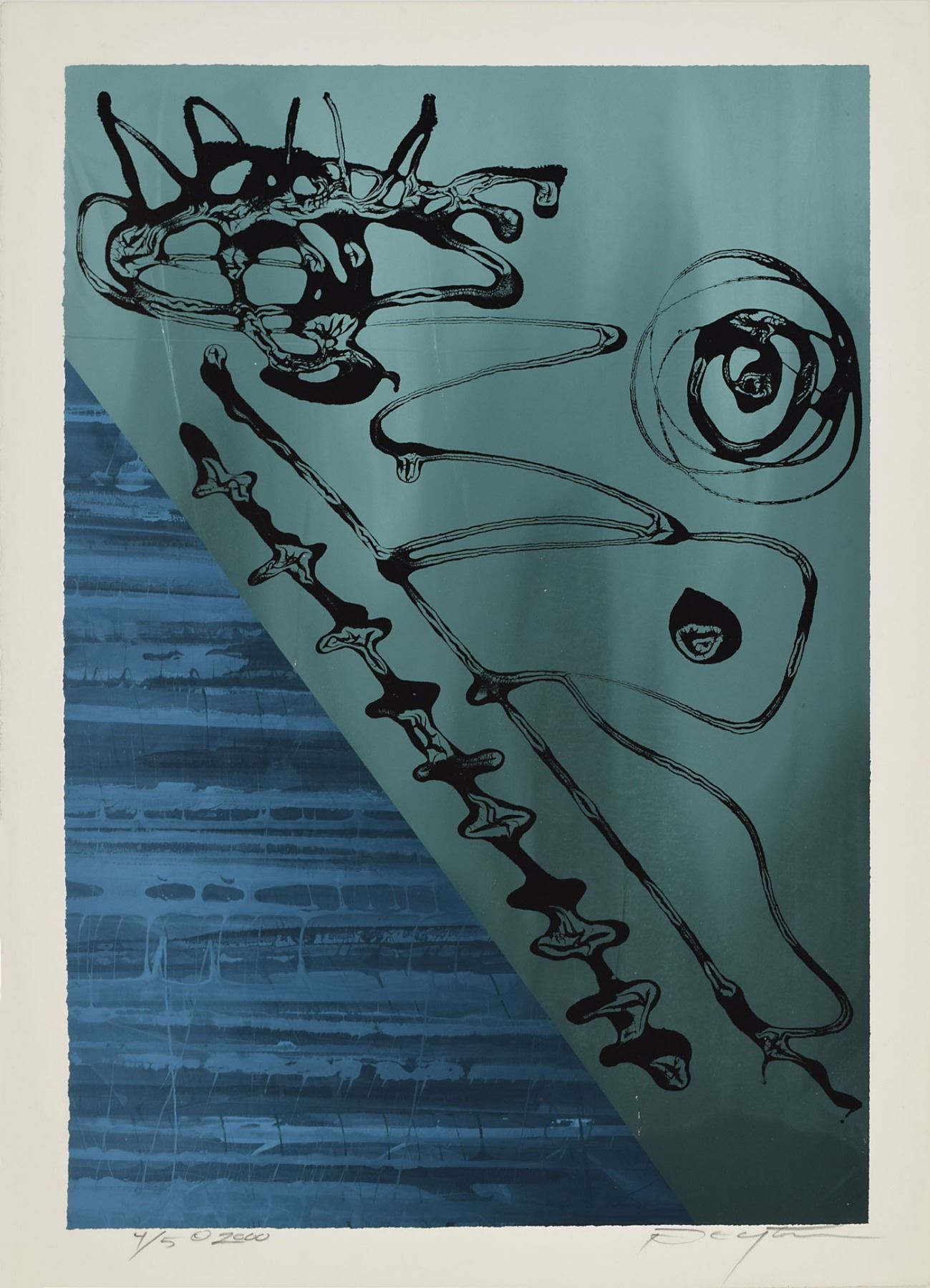 Color limited edition 22 x 30 screenprint by Peyton Scott Russell, entitled 'Sunland 3,' numbered 4/5, signed in the lower border in pencil by the artist, "Peyton," and marked with a copyright date of 2000. This blue, gray, and black artwork portrays a symbolic surreal face superimposed and intertwined with nature. From a series of prints that explored the human face as it relates to the landscape atmosphere, sun, and moon. In fine condition, with a surface scratch to the upper left.
