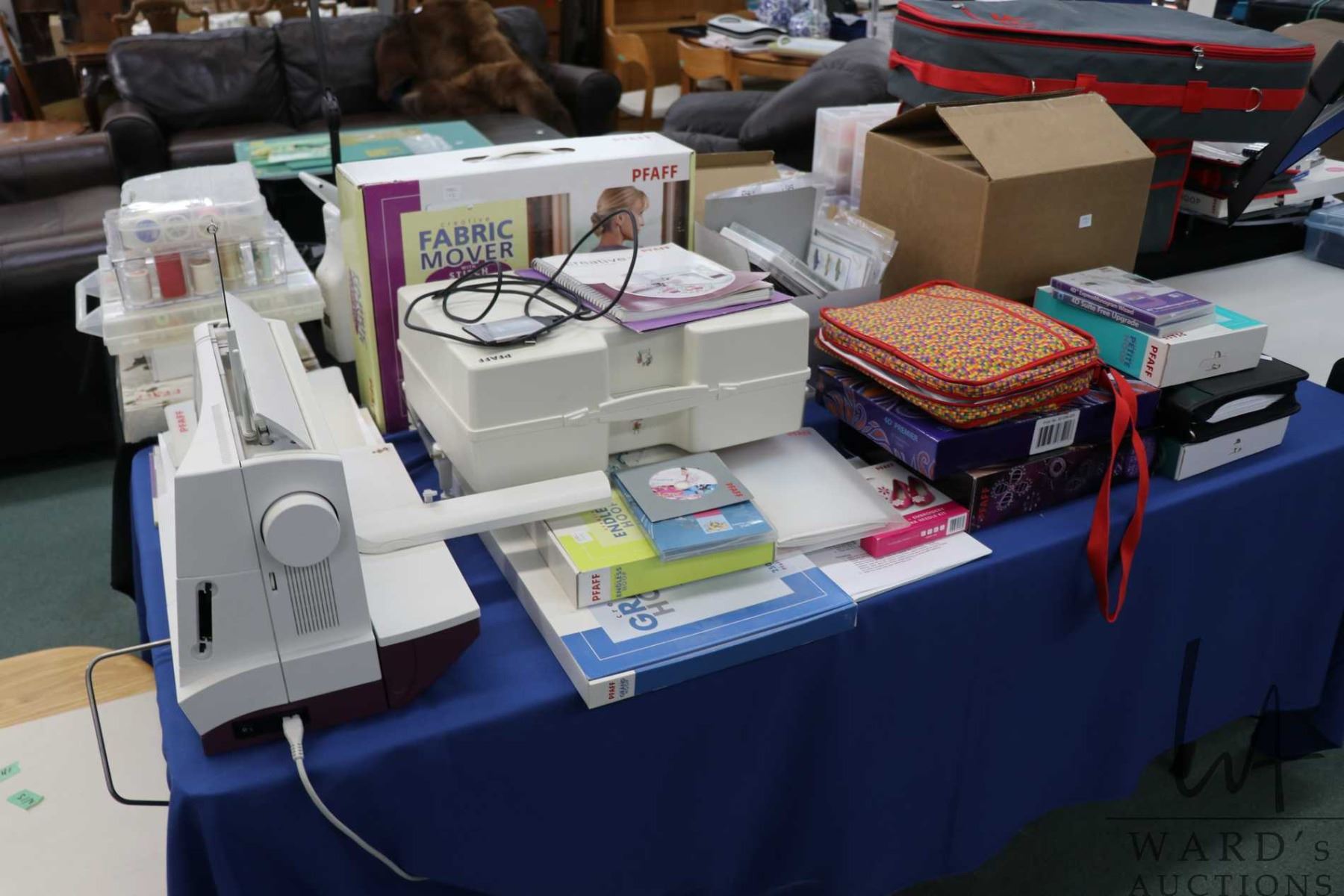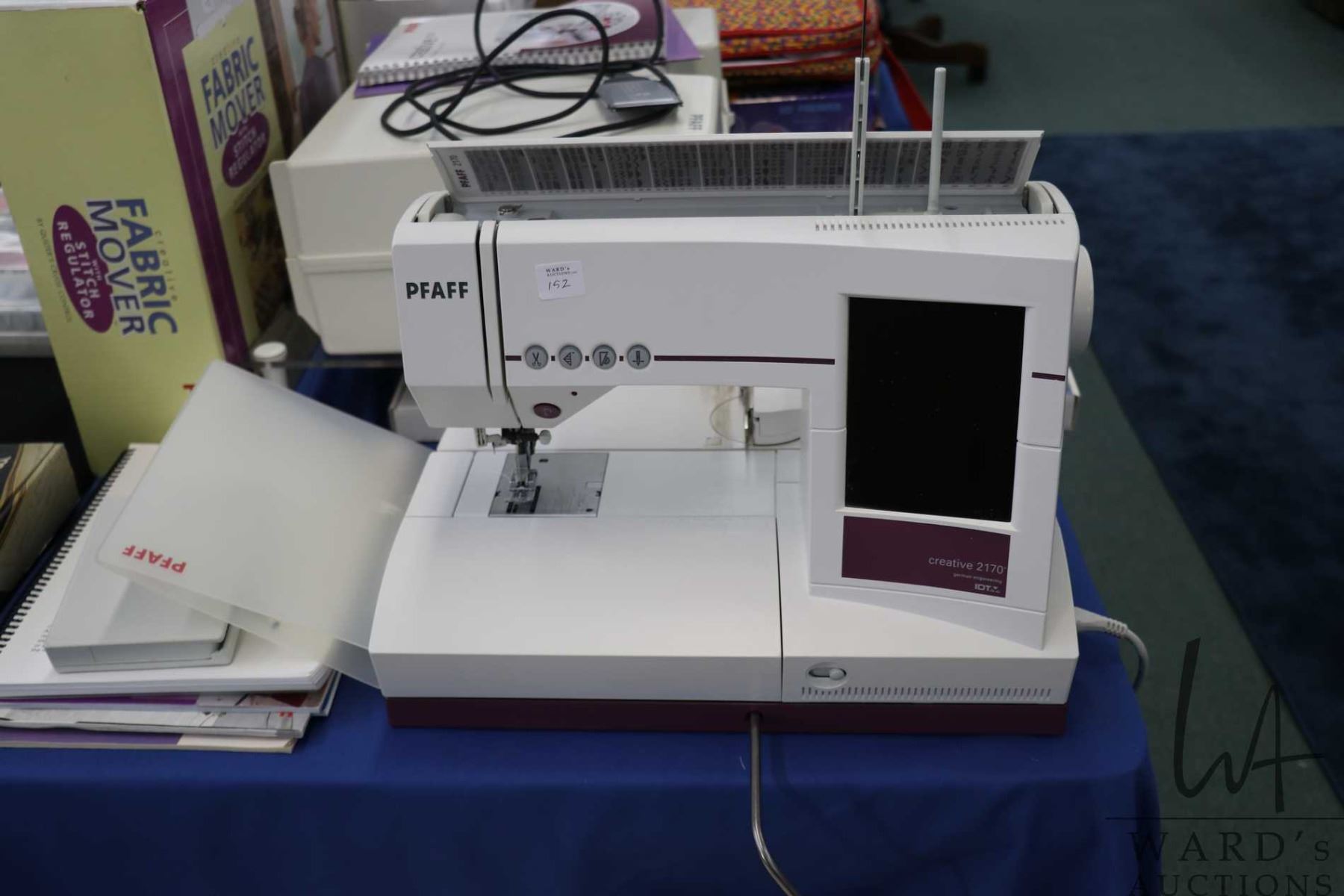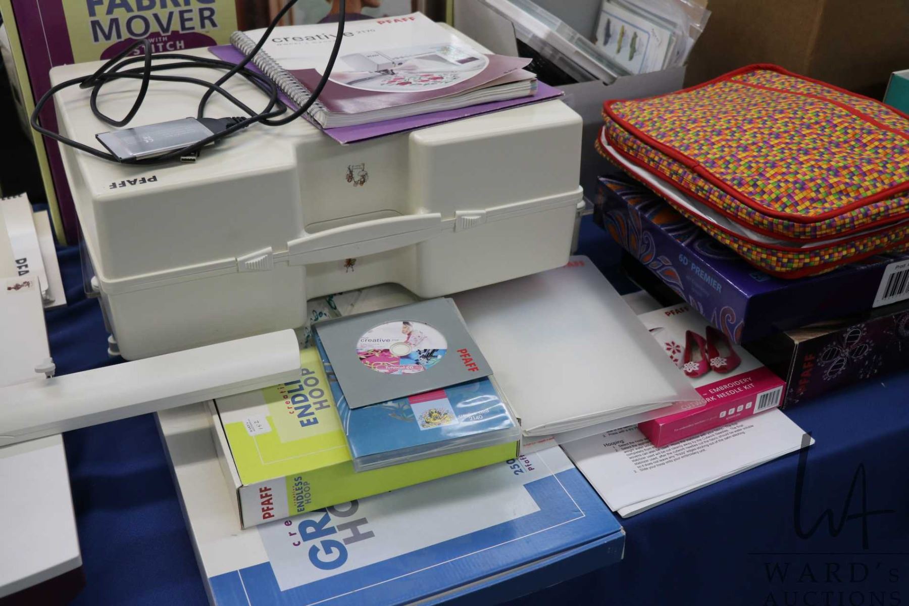 Pfaff Creative 2170 embroidery machine and accessories including embroidery unit with module, USB PC card, 2170, 2144, 2140, 2134 Endless Hopp 180 X 100mm, Endless hoop manual, flexible grid guide, Pfaff Creative sewing and embroidery machine arm in case model RA 3021A, Pfaff Creative Grand Hoop 2100 series 250mm X 225mm with support table, Pfaff Creative 2170 owner's manual. Pfaff Creative fabric mover, Pfaff Creative card 300, designs on CD rom, 3D, 4D, 5D and 6D upgrade kits, large selection of feet and accessories plus binders filled with downloaded embroidery design CD and accompanying printed instructions plus etc. Machine working at time of cataloguing