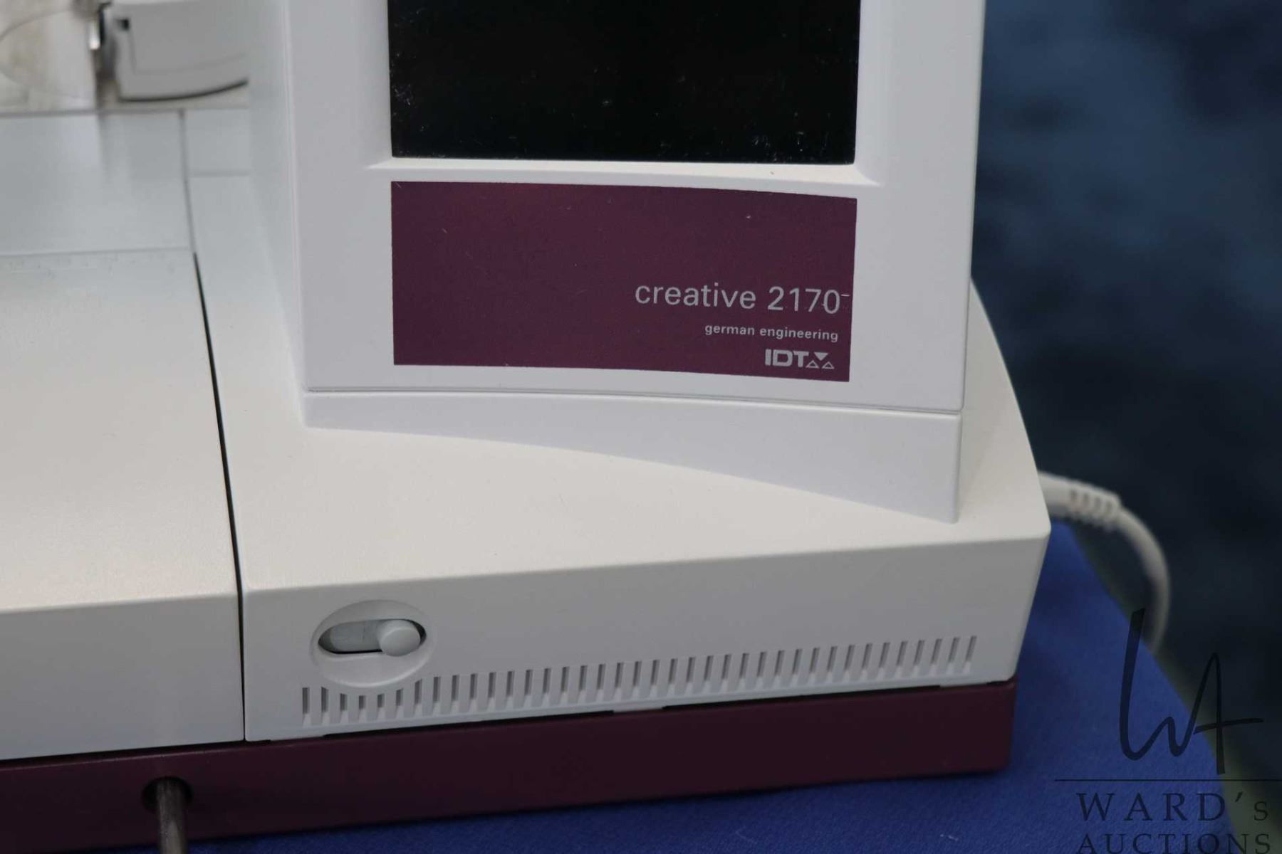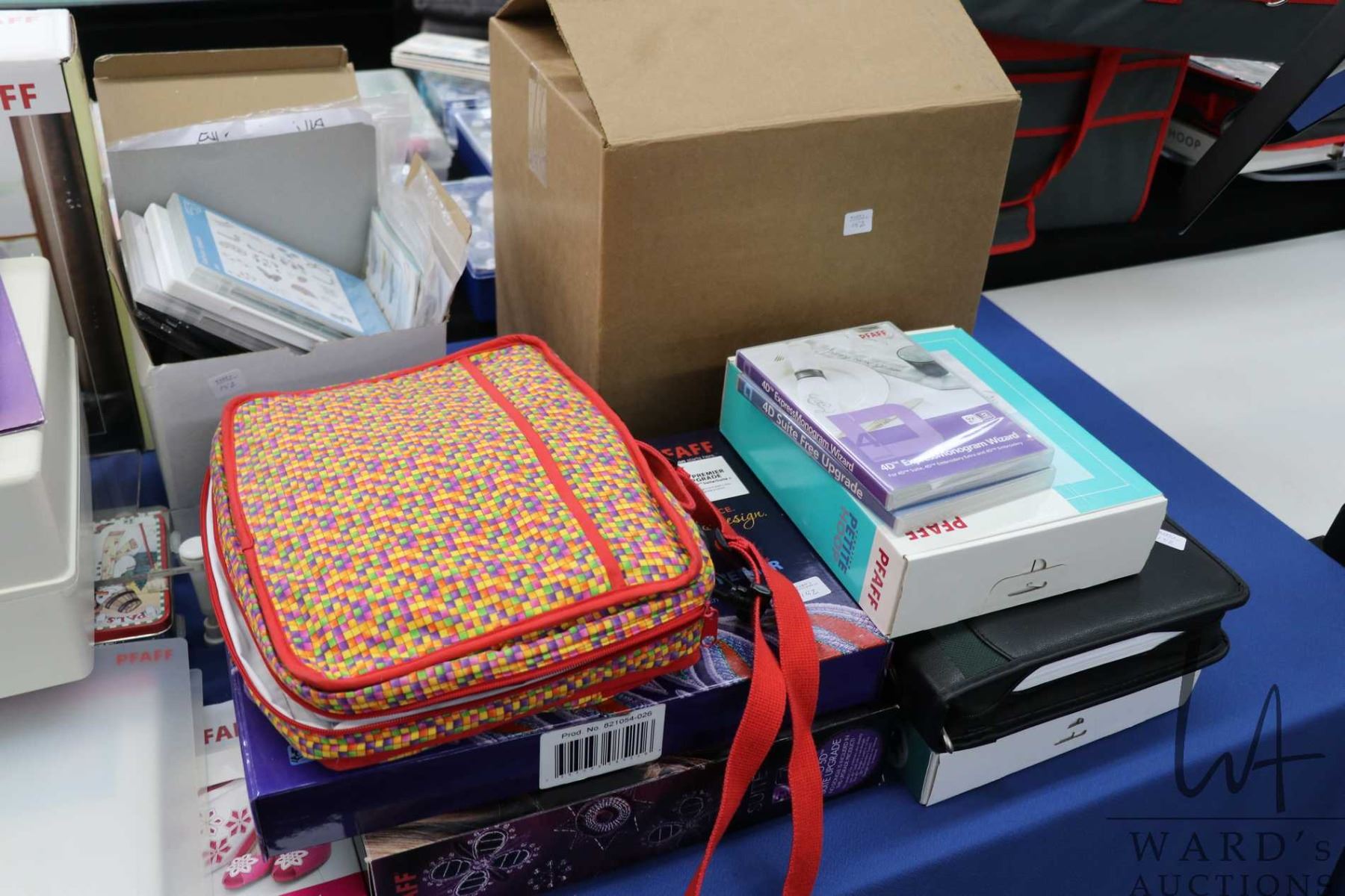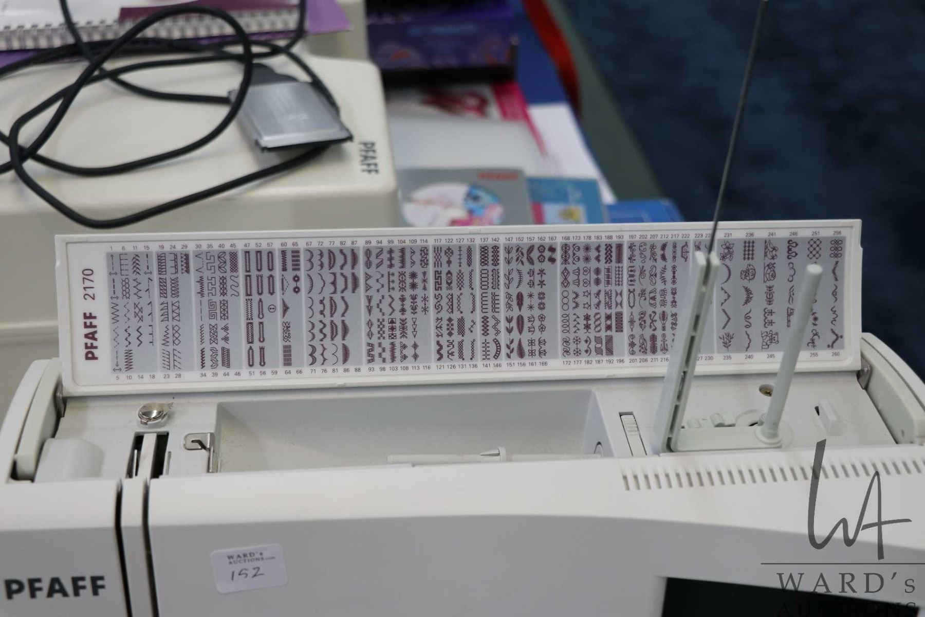 Pfaff Creative 2170 embroidery machine and accessories including embroidery unit with module, USB PC card, 2170, 2144, 2140, 2134 Endless Hopp 180 X 100mm, Endless hoop manual, flexible grid guide, Pfaff Creative sewing and embroidery machine arm in case model RA 3021A, Pfaff Creative Grand Hoop 2100 series 250mm X 225mm with support table, Pfaff Creative 2170 owner's manual. Pfaff Creative fabric mover, Pfaff Creative card 300, designs on CD rom, 3D, 4D, 5D and 6D upgrade kits, large selection of feet and accessories plus binders filled with downloaded embroidery design CD and accompanying printed instructions plus etc. Machine working at time of cataloguing