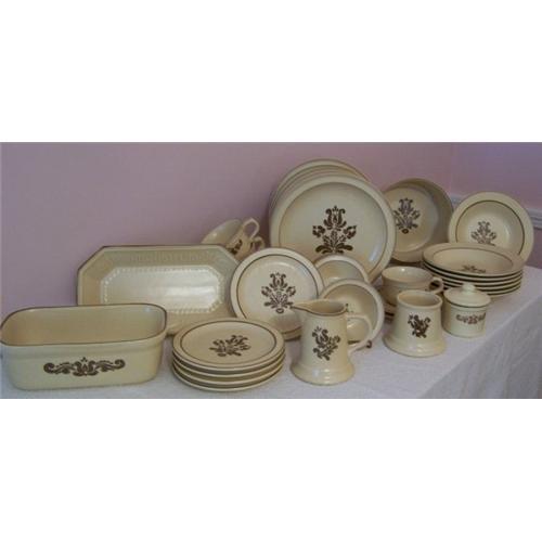 5 Luncheon plates, 4 cup/saucers, 7 large 8.75" soup bowls that also double as vegetable/serving bowls, 4 desert bowls, Souffle dish, 2 Qt. Loaf dish, Cream/Sugar, Small covered bowl, and bread server. There are no chips, cracks. If you would like any additional information or pictures please feel free to e-mail. I will quote estimated shipping on request, but exact shipping at time of sale. Thanks for looking!
