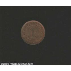Pfennig 1894A. KM1, Choice UNC with considerable red mint luster. Well above average for this popular series. Important notice: We expect to be auctioning lots at the rate of 200-250 per hour. Sometimes eBay Premier live bid software cannot keep up with that pace, so we strongly recommend that you place a realistic proxy bid now as insurance to avoid disappointment. Also please note that all Heritage/CAA lots purchased through eBay Premier carry a 20% Buyer's Premium. Please make sure you read the Terms and Conditions.