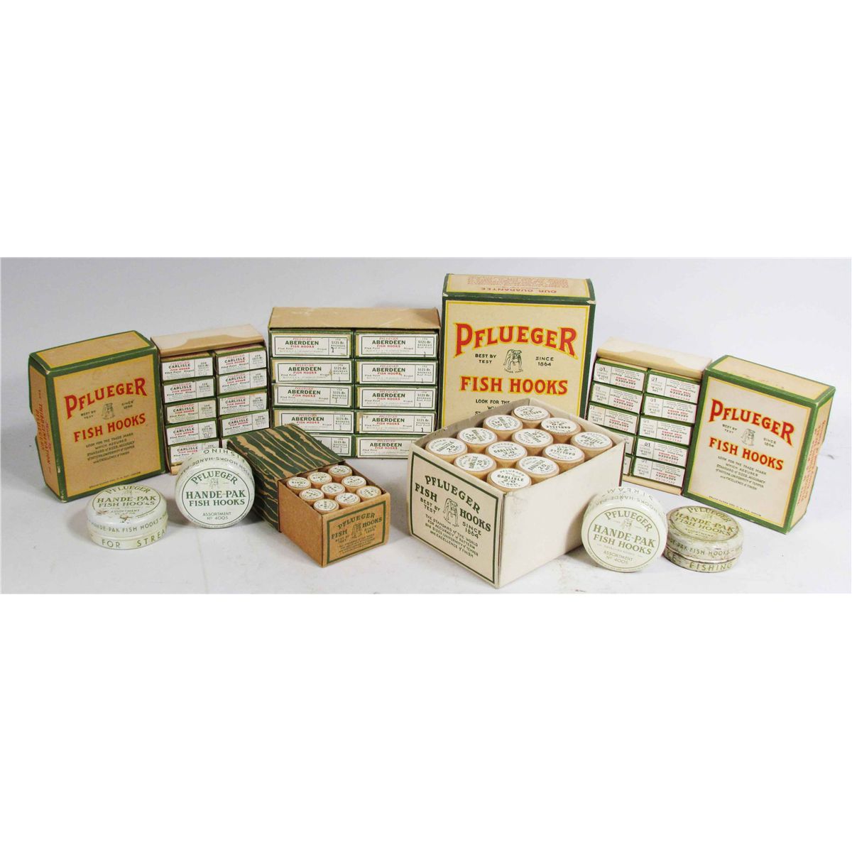 Pflueger Fishing Hooks including Handy-Pak Assortment No. 4005, Aberdeen No. 5121, Carlisle No. 3321-BR, Kirby No. 8721, and Carlisle No. 8921. All containers full of product, NOS.