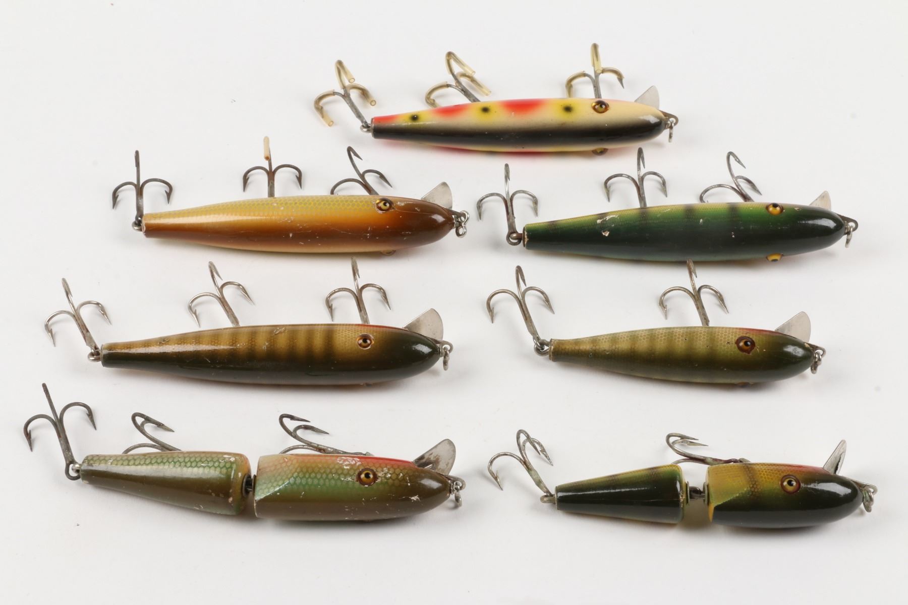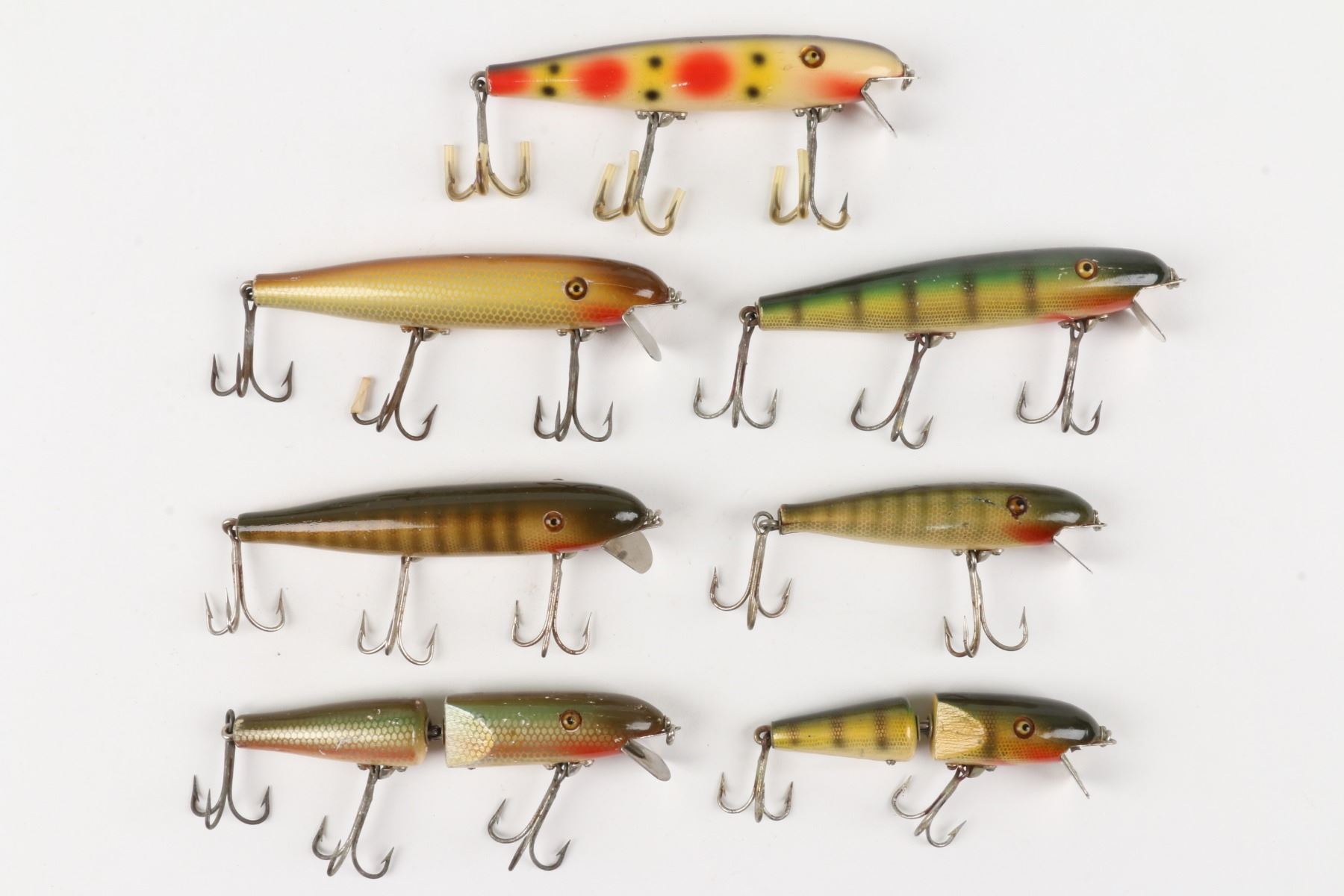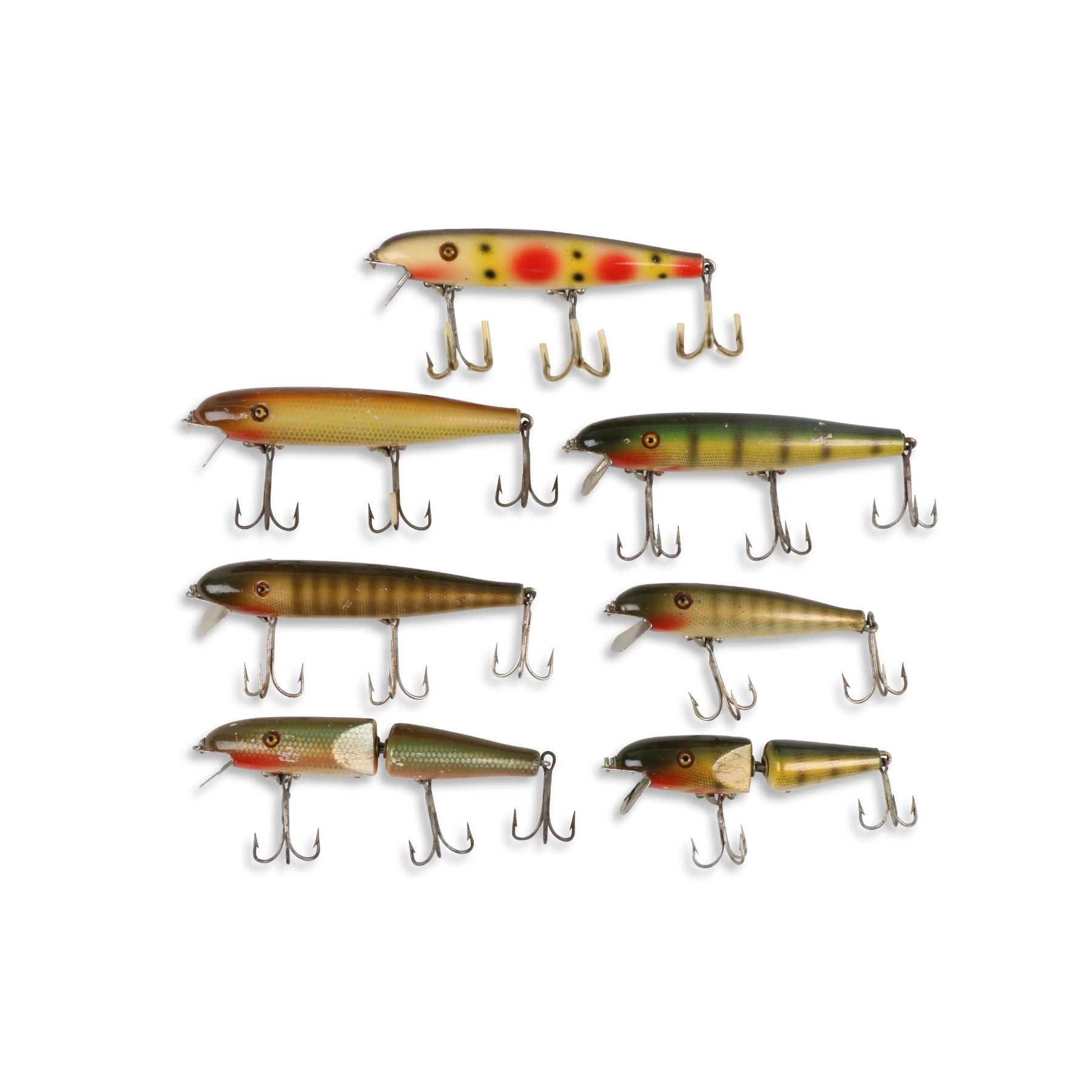 Pflueger, United States. 1950s. Material: Wood. Quantity: 7. Grade: VG. 3" - 4.5" each. Est. $100-125.