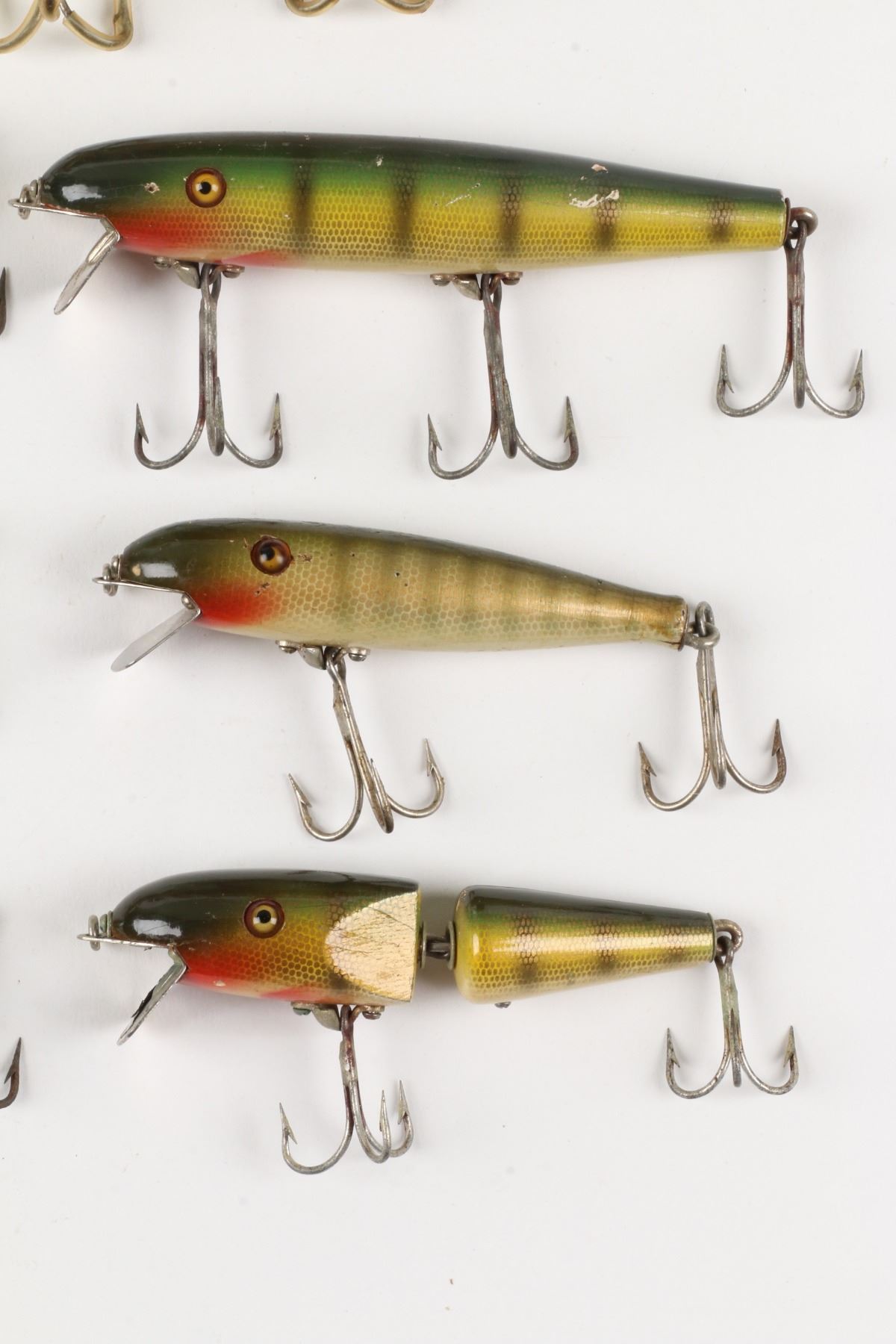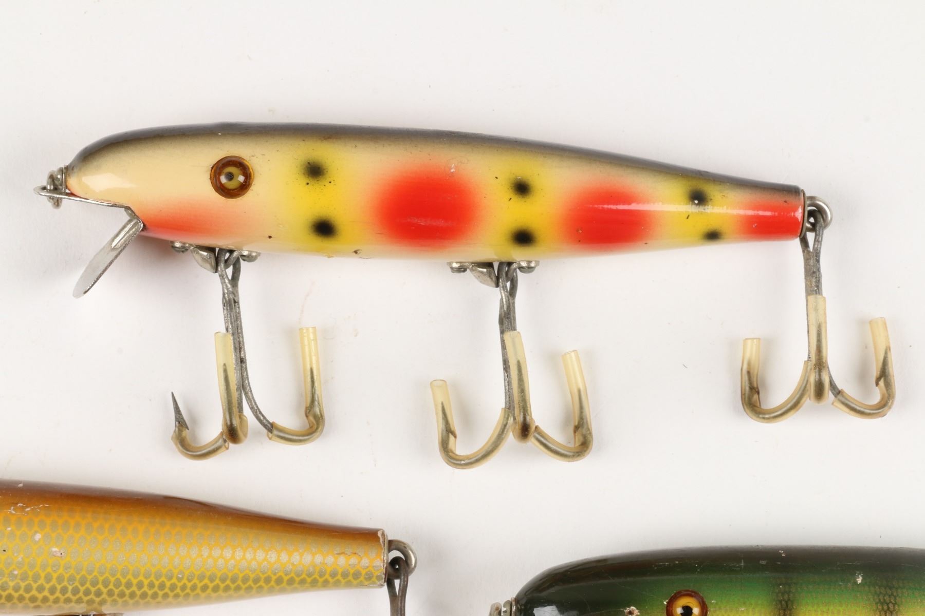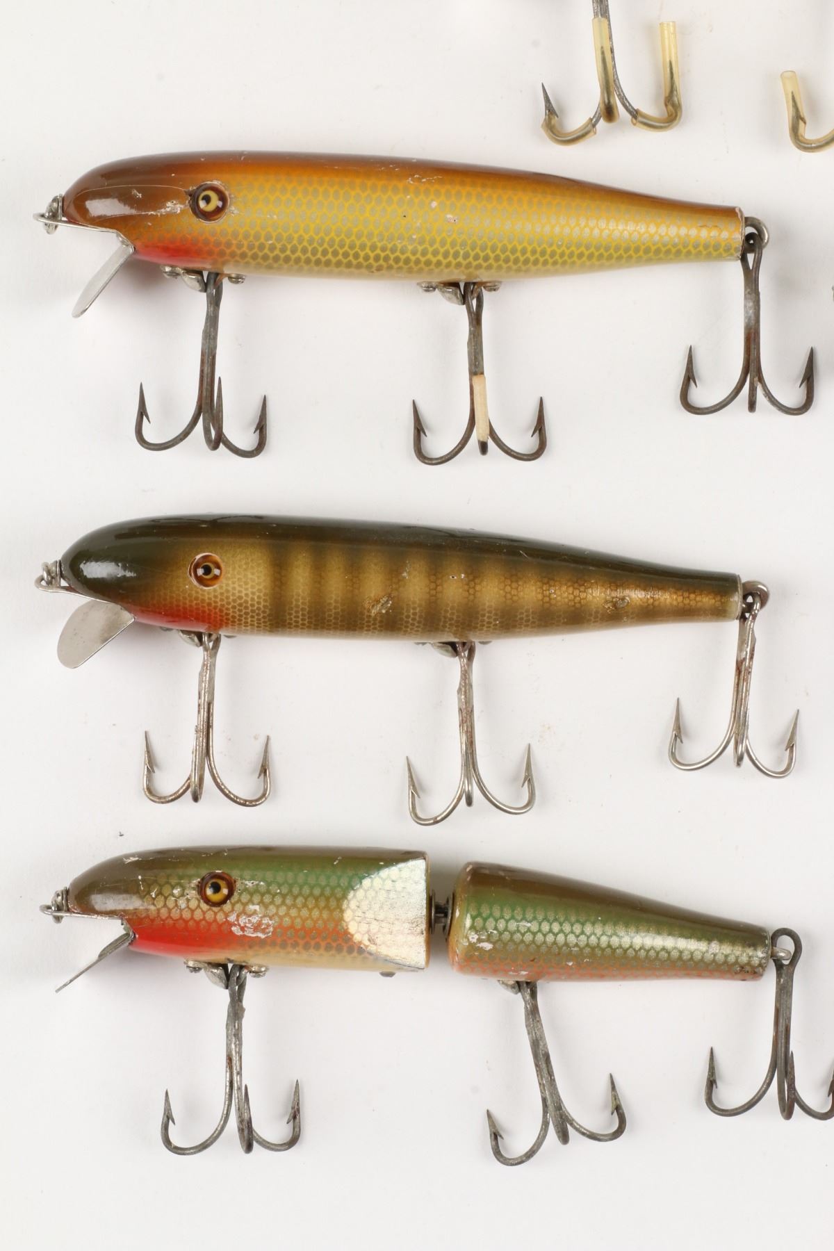 Pflueger, United States. 1950s. Material: Wood. Quantity: 7. Grade: VG. 3" - 4.5" each. Est. $100-125.