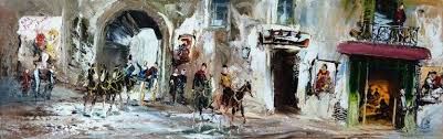 Shalva Phachoshvili Along the Way ORIGINAL ACRYLIC. Artist: Phachoshvili Shalva - Title: Along the Way - Medium: Acrylic on Canvas - Signature: This one-of-a-kind work is hand-signed by the artist at the bottom of the image - Image Size: Approximately 9 inches x 28 inches - Framed: Unframed and Unstretched - Details: This work comes with a Certificate of Authenticity - Biography: Phachoshvili Shalva was born in Georgia Tbilisi in the year 1963. His works he shows many details of the late 19-th century bohemian lifestyle in Europe. He is an impressionist painter who excels at capturing people in their regular life with the color and the movement of the life present. Phachoshvili's skilled depiction of people relies on his painting style which is highly linear and gives great emphasis to contour. He often applies the paint in long, thin brushstrokes. Many of his works may best be described as drawings in colored paint. His dramatic use of color and texturing capture his subject matter with unique flair.