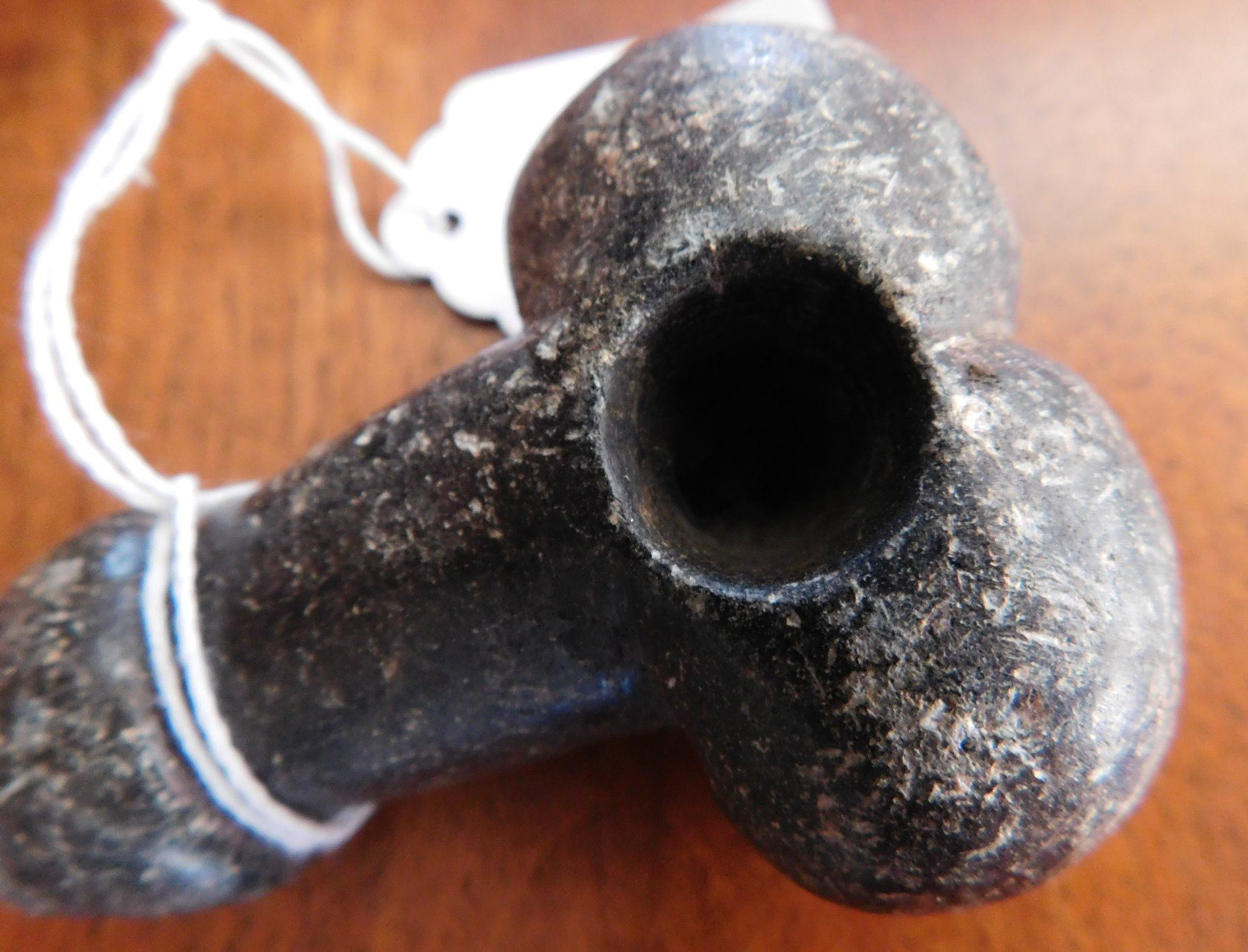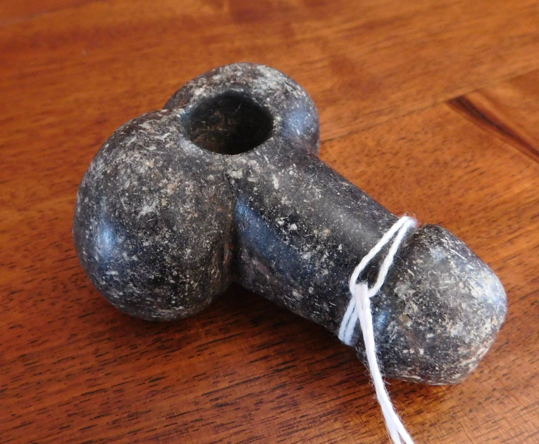 Phallic Pipe, pre-historic item. Made of steatite, the item measures 3" x 2 1/2". Chumash, Orange County, California. Condition: Good, scratches, see images. Shipping: $13.50 w/insurance and signature.