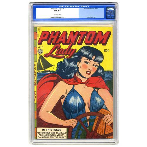 <B>Phantom Lady #14 (Fox Features Syndicate, 1947) CGC NM 9.4 Off-white pages.</B></I> Here's the highest-graded copy of this issue, and the only one graded above 9.0 by CGC as of this writing. It's the second issue of this much-collected series, and thus only the second outing for the new, sexier Phantom Lady (who wasn't such a racy character in her previous appearances in Quality's Police Comics). The interior art is by "good girl" specialist Matt Baker. Overstreet 2005 NM- 9.2 value = $3,300. CGC census 12/05: 1 in 9.4, none higher.