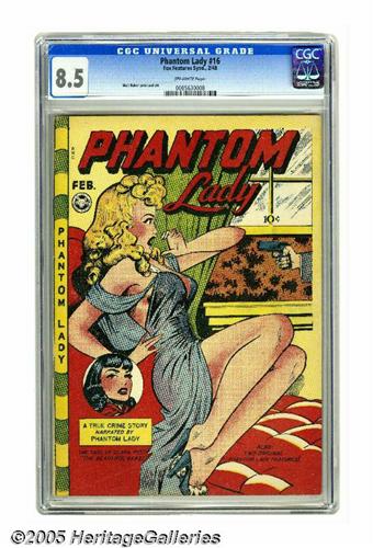 <B>Phantom Lady #16 (Fox Features Syndicate, 1948) CGC VF+ 8.5 Off-white pages.</B></I> Matt Baker turned on the "headlights" for this truly memorable cover. And we'd be negligent if we didn't mention that negligee. A sexy classic! Even the title character, though relegated to an inset, adds a sultry gaze of her own. Inside the comic, true crime tales and, yes, even some negligee panels await. It's a must for Baker fans... and who isn't one? Overstreet 2005 VF 8.0 value = $1,588; VF/NM 9.0 value = $2,444. CGC census 4/05: 1 in 8.5, 4 higher.
