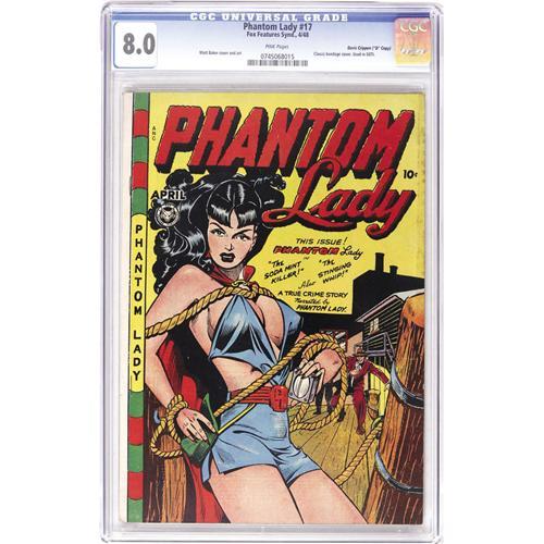 <B>Phantom Lady #17 Davis Crippen ("D" Copy) pedigree (Fox Features Syndicate, 1948) CGC VF 8.0 Pink pages.</B></I> This is the most famous Matt Baker <B>Phantom Lady</B></I> cover, and surely one of the sexiest covers ever to grace a comic book. The issue was mentioned in the book <B>Seduction of the Innocent</B></I>, with author Fredric Wertham observing "Sexual stimulation by combining 'headlights' with the sadist's dream of tying up a woman." By the way, if you're wondering about CGC's "pink pages" notation, the comic was produced on pink paper stock by Fox, in an effort to save a few bucks, no doubt! Every single copy of this issue that we've ever auctioned has sold for above the Guide value, and since this "D" copy is one of the best around, we have no doubt that this trend will continue. Overstreet 2006 VF 8.0 value = $3,864. CGC census 6/06: 1 in 8.0, 4 higher. <I>From the Crippen Collection.</B></I> <BR><BR><B>Important notice:</B> Heritage usually auctions material at the rate of 200-250 lots per hour. On some occasions eBay Live bid software or the Internet may not be able to keep up with the pace of the auction. We recommend placing a realistic absentee bid now as insurance to avoid disappointment. Occasionally the auctioneer may eliminate or reject an eBay Live bid, and the auctioneer may also reopen a lot after the close of the eBay live bidding (usually because we missed an audience bid), and may reject your bid even if it shows you as the winning bidder. By bidding via eBay Live, you agree that Heritage may award the lot to another bidder at its sole discretion under the circumstances described above or any other reasonable circumstances. Since eBay bids are not shown to us until we open the lot on the floor, we treat those bids just like floor bids. In most cases the floor responds before the eBay bid is presented to us, due to Internet lag time, so for consistency we have made it a policy that floor bids are always considered first over tie eBay live bids. Also please note that all Heritage lots purchased through eBay Live carry a 22.5% Buyer's Premium. Please make sure you read the Terms and Conditions before you bid. This lot is being auctioned in conjunction with a live floor auction by Heritage Auction Galleries. All final auction and invoice information will be supplied by Heritage Auction Galleries, and all other information should be considered preliminary. Lot:41001 <BR><BR><B>Winning Notification and Billing:</B> After the FINAL session in this auction is complete, Heritage will send e-mail and snail mail invoices. This process normally takes several days. All final auction and invoice information will be supplied by Heritage Auction Galleries, and all other information should be considered preliminary. <BR><BR>This auction will be conducted on a live auction floor and over the Internet through eBay Live. If you choose to place an absentee bid, please take a moment to <font color='#0000ff'><u><a href='http://pages.ebay.com/liveauctions/help/before/laabsentee.html'>learn how eBay Live absentee bidding works</a></u></font><font color='#000000'>
