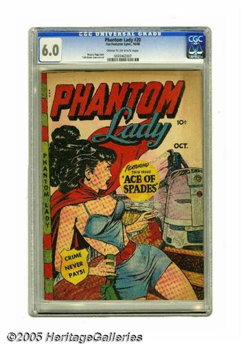 <B>Phantom Lady #20 (Fox Features Syndicate, 1948) CGC FN 6.0 Cream to off-white pages.</B></I> This stunning issue features a Matt Baker cover and <I>two</B></I> interior stories illustrated by Baker, the master of "good girl" art. It's hard to believe that the fetching Phantom Lady would have her series cancelled after a mere three more issues. But the reasons for her continuing popularity should be obvious -- what red-blooded comic collector could resist that sultry costume, and Baker's mesmerizing artwork? Overstreet 2005 FN 6.0 value = $426. CGC census 4/05: 1 in 6.0, 2 higher.