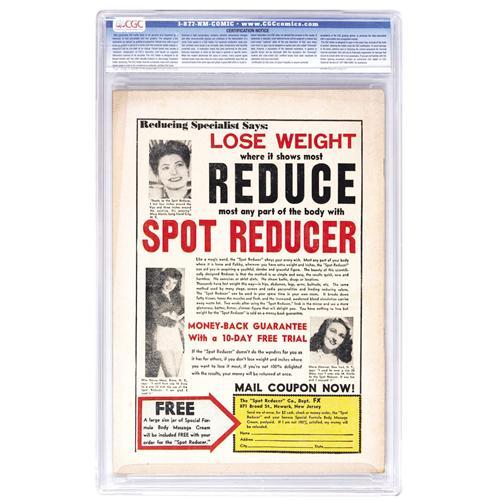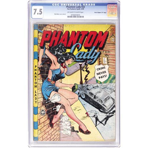 <B>Phantom Lady #22 Davis Crippen ("D" Copy) pedigree (Fox Features Syndicate, 1949) CGC VF- 7.5 Off-white to white pages.</B></I> No NM-type copies of this issue have surfaced to date, and we think poor paper stock has a lot to do with it. As Robert Jennings noted in <B>The Comic World</B></I>, "With issue #22 <B>Phantom Lady</B></I> was being printed on a cheaper, coarser grade of paper." This is the second-to-last issue of the Fox run, and it's got a cover by the great Matt Baker. Overstreet 2006 VF 8.0 value = $900. CGC census 6/06: 1 in 7.5, 1 higher. <I>From the Crippen Collection.</B></I> <BR><BR><B>Important notice:</B> Heritage usually auctions material at the rate of 200-250 lots per hour. On some occasions eBay Live bid software or the Internet may not be able to keep up with the pace of the auction. We recommend placing a realistic absentee bid now as insurance to avoid disappointment. Occasionally the auctioneer may eliminate or reject an eBay Live bid, and the auctioneer may also reopen a lot after the close of the eBay live bidding (usually because we missed an audience bid), and may reject your bid even if it shows you as the winning bidder. By bidding via eBay Live, you agree that Heritage may award the lot to another bidder at its sole discretion under the circumstances described above or any other reasonable circumstances. Since eBay bids are not shown to us until we open the lot on the floor, we treat those bids just like floor bids. In most cases the floor responds before the eBay bid is presented to us, due to Internet lag time, so for consistency we have made it a policy that floor bids are always considered first over tie eBay live bids. Also please note that all Heritage lots purchased through eBay Live carry a 22.5% Buyer's Premium. Please make sure you read the Terms and Conditions before you bid. This lot is being auctioned in conjunction with a live floor auction by Heritage Auction Galleries. All final auction and invoice information will be supplied by Heritage Auction Galleries, and all other information should be considered preliminary. Lot:41001 <BR><BR><B>Winning Notification and Billing:</B> After the FINAL session in this auction is complete, Heritage will send e-mail and snail mail invoices. This process normally takes several days. All final auction and invoice information will be supplied by Heritage Auction Galleries, and all other information should be considered preliminary. <BR><BR>This auction will be conducted on a live auction floor and over the Internet through eBay Live. If you choose to place an absentee bid, please take a moment to <font color='#0000ff'><u><a href='http://pages.ebay.com/liveauctions/help/before/laabsentee.html'>learn how eBay Live absentee bidding works</a></u></font><font color='#000000'>