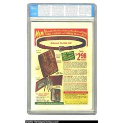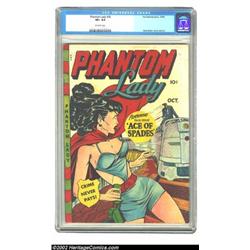 Phantom Lady #22 (Fox, 1949) CGC VF+ 8.5 Off-white pages. The lovely Phantom Lady image by Matt Baker graces this absolutely marvelous copy of Phantom Lady #22. The cover is so fresh and white that it sets off the deep red of the logo and Phantom Lady's cape. Add to that the off-white pages and excellent condition and you have an overall outstanding gem of a Fox comic. According to the CGC census, this is not only the highest-graded copy, this is the ONLY graded copy. You may not want to take her home to meet Mom, but there's no one to blame but yourself if you let her get away. Overstreet 2002 VF 8.0 value = $825. Important notice: We expect to be auctioning lots at the rate of 200-250 per hour. Sometimes eBay Premier live bid software cannot keep up with that pace, so we strongly recommend that you place a realistic proxy bid now as insurance to avoid disappointment. Also please note that all Heritage/CAA lots purchased through eBay Premier carry a 20% Buyer's Premium. Please make sure you read the Terms and Conditions.