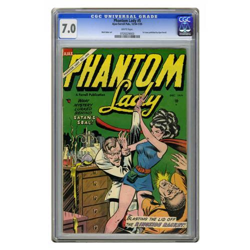 <B>Phantom Lady (second series) #5 (Ajax / Farrell, 1955) CGC FN/VF 7.0 White pages.</B></I> This issue (the first, despite the numbering) marked the resumption of Phantom Lady's comic book career after her run at Fox came to an end five years earlier. Artist Matt Baker returns to the character. Overstreet 2005 FN 6.0 value = $345; VF 8.0 value = $719. CGC census 12/05: 1 in 7.0, 2 higher.