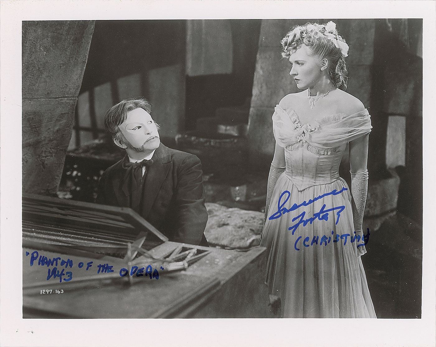 Glossy 10 x 8 photo of Claude Rains as the masked Erique Claudin and Susanna Foster as Christine DuBois in the 1943 film Phantom of the Opera, signed in blue felt tip, "Susanna Foster (Christine), 'Phantom of the Opera,' 1943." In fine condition. Originally obtained by in-person specialist Mike Wehrmann.