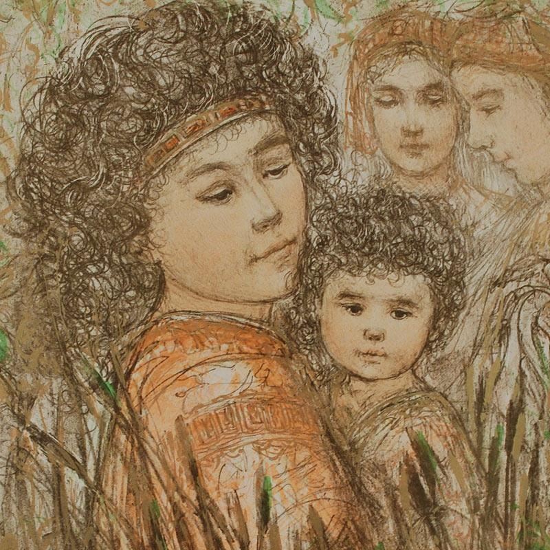 "Pharaoh's Daughter with Moses in Bulrushes" is a limited edition lithograph on paper, numbered and hand signed by Edna Hibel (1917-2014). Includes Certificate of Authenticity! Measures approx. 18" x 22" (with border), 15" x 20" (image).