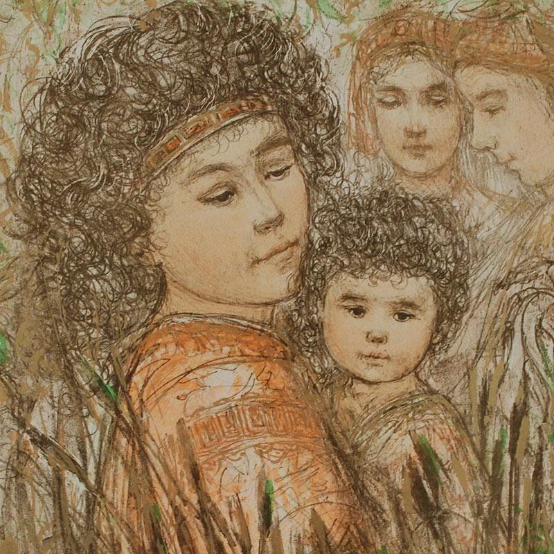 "Pharaohs Daughter with Moses in Bulrushes" is a limited edition lithograph on paper numbered and hand signed by Edna Hibel (1917-2014). Includes Certificate of Authenticity! Measures approx. 18" x 22" (with border) 15" x 20" (image).