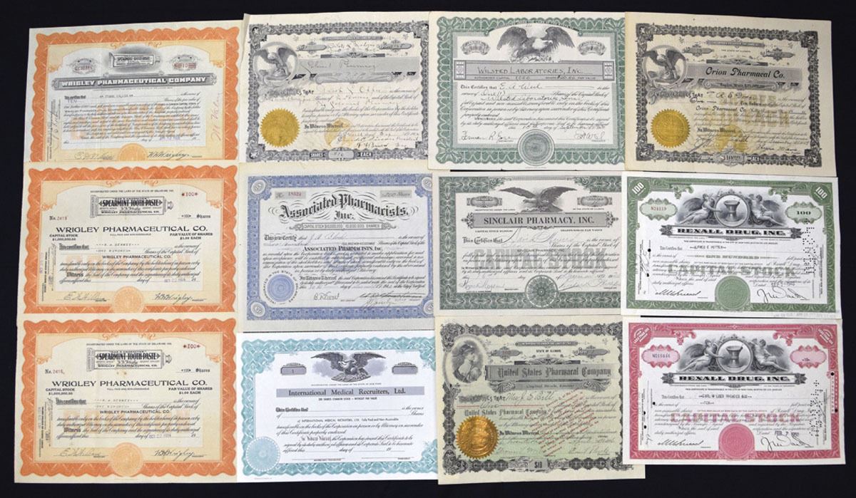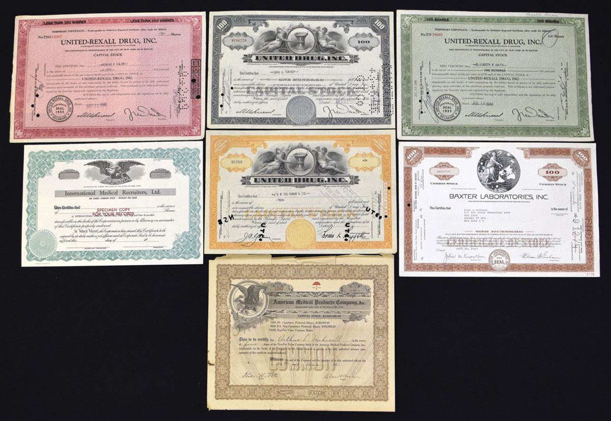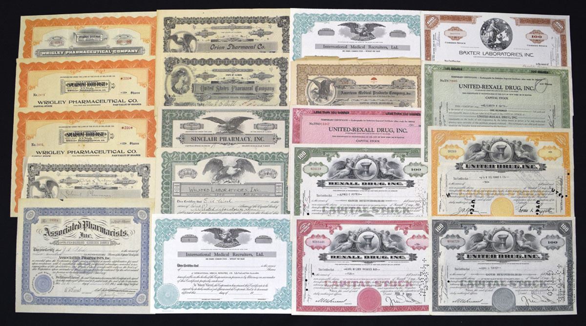 Various States, ca. 1890s-1960s. Lot of 19 I/U and I/C Stock Certificates from pharmaceutical firms, laboratories, and drug companies, many with medical-themed imagery and embossed seals. Highlights include: Wrigley Pharmaceutical Co.; Rexall Drug, Inc.; United Drug, Inc.; United-Rexall Drug, Inc.; Baxter Laboratories, Inc.; and Orion Pharmacal Co. Certificates display colorful borders in orange, green, red, blue, and brown, with eagle vignettes, pharmaceutical emblems, and allegorical figures. Condition generally VF to XF with folds, punch and ink cancellations, and minor edge wear. (19). Sold "AS IS" no returns accepted.